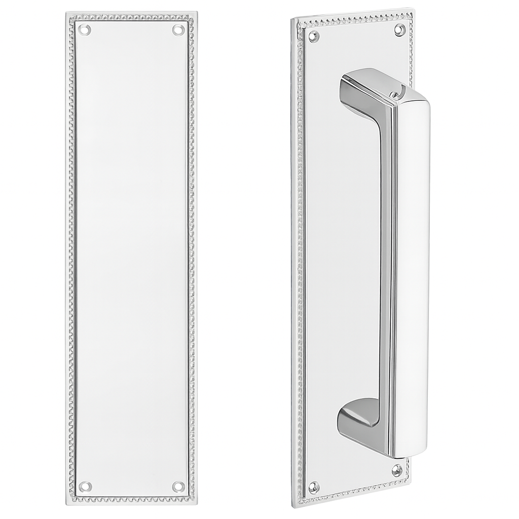This push & pull door set is designed for any door in your home or business (such as entryway or hallway doors). It is constructed from solid brass and measures 3 inch wide by 12 inches tall. The handle C-to-C measures 8 Inches. The handle is Concealed Surface mounted. Comes in a variety of finishes.