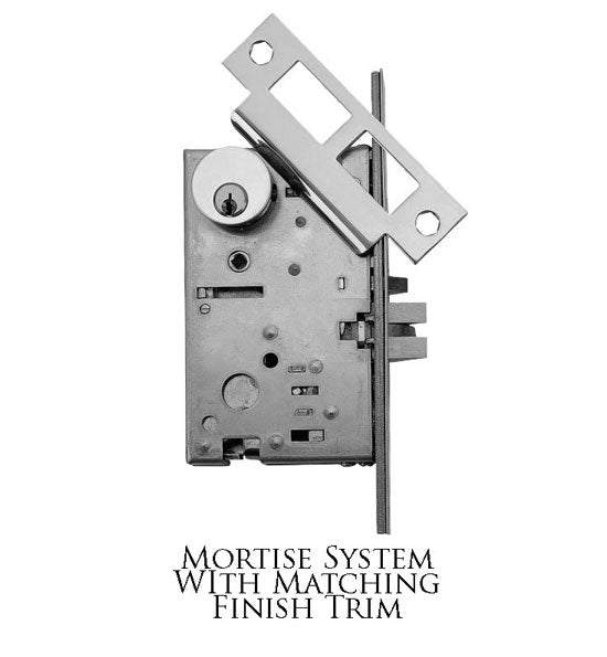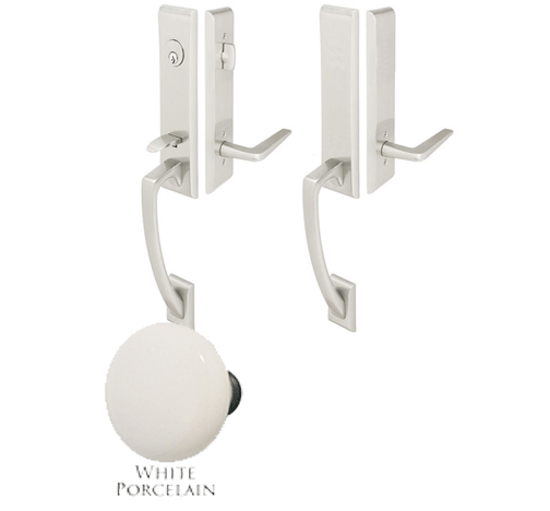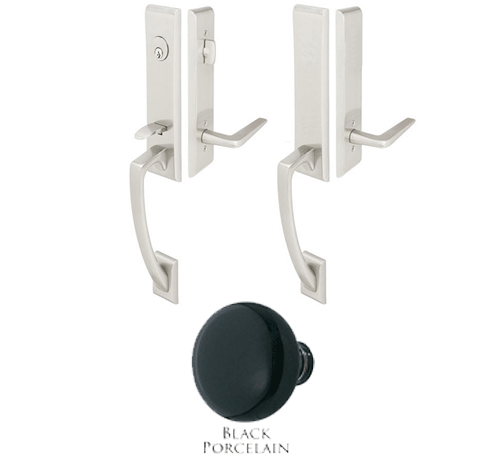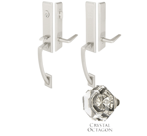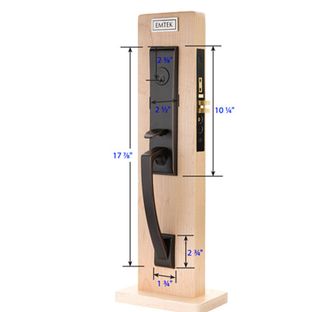 This entryway set measures 2 1/2 inches wide by 17 7/8 inches tall. Various styles of knobs available at no additional charge. Entryway mortise backset options are 2 1/2 inch or 2 3/4 inch. The overall grip thickness is 1 inch. The clearance between the door and grip is 2 1/4 inches. The plates have a thickness of 1/2 inch. The plates have a thickness of 1/2 inch. This is a complete set. For a mirrored look – the faux circular disk that matches the plate gives the illusion of symmetry is used on the double entryway sets. This particular product has a lead time of 3 to 5 business days.