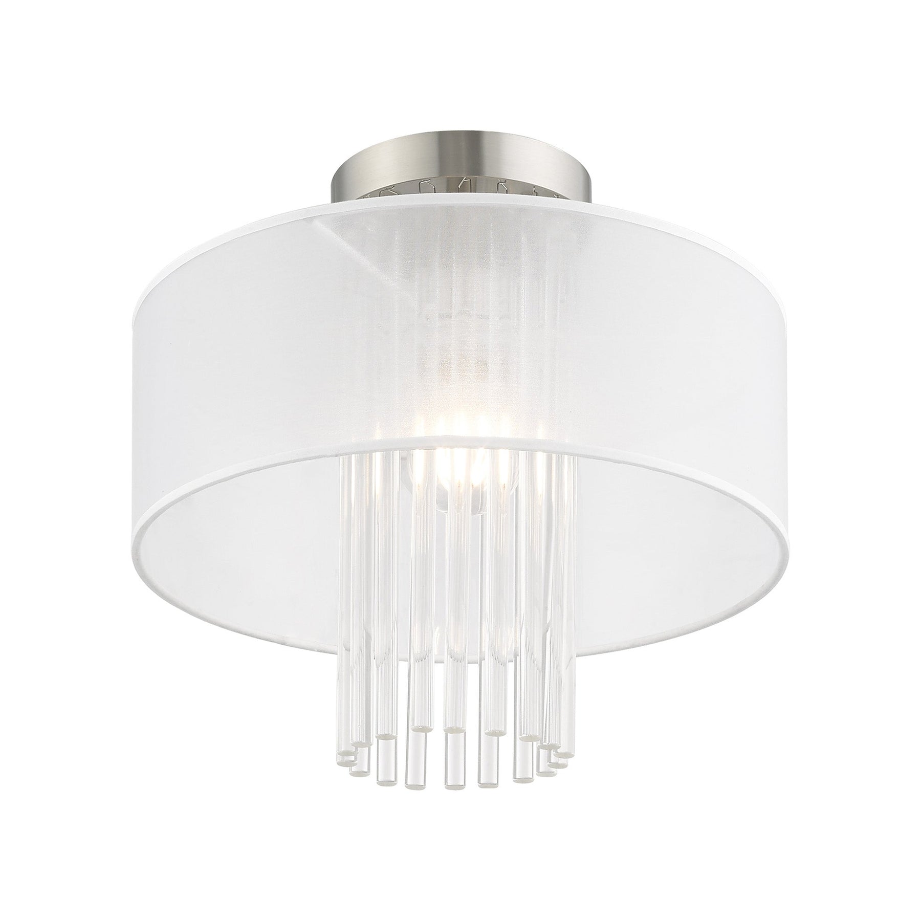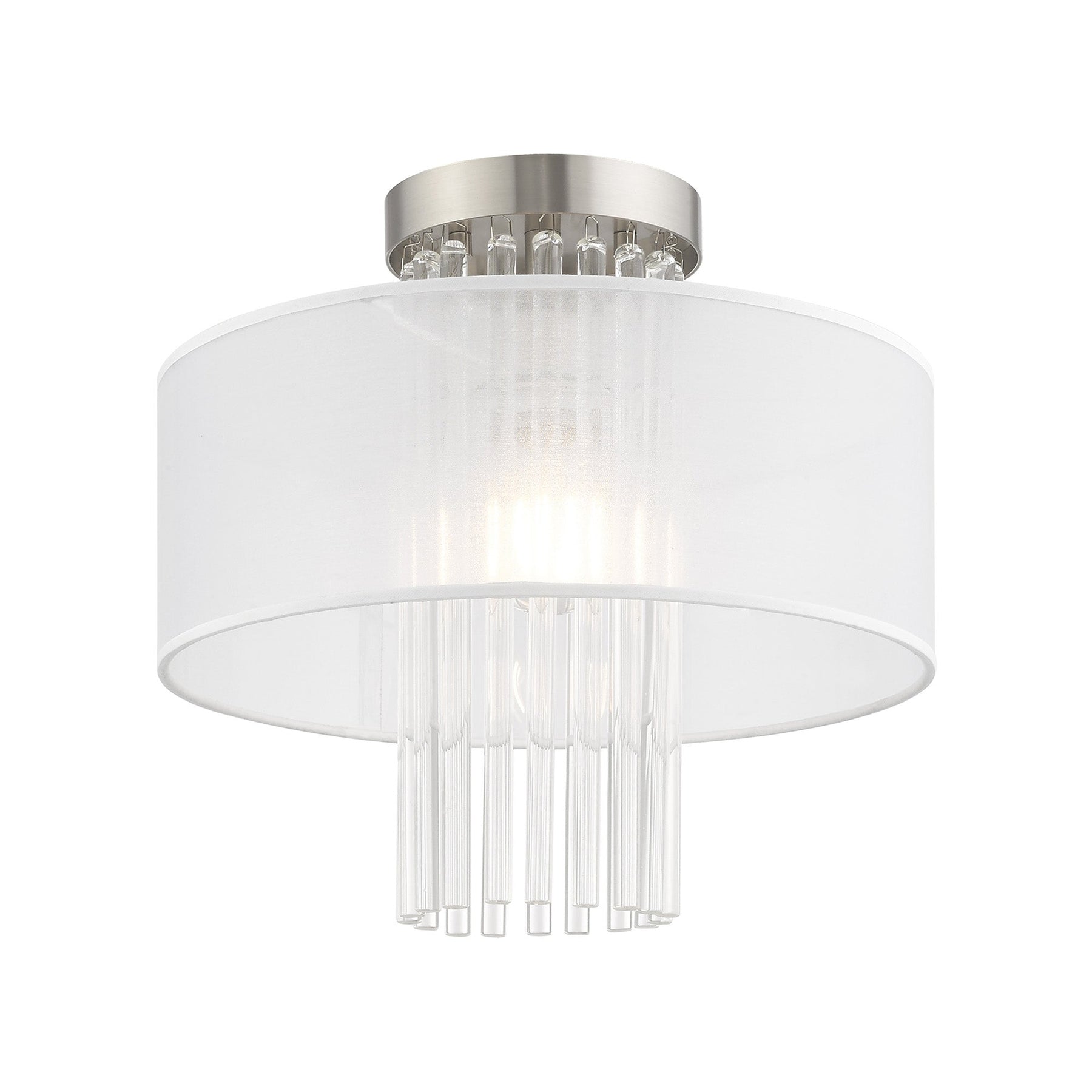 The Alexis Semi-Flush Mount in Brushed Nickel is a stunning addition to contemporary decor schemes, exuding elegance and sophistication. Measuring 12.5 inches in height and 13 inches in diameter, this fixture features beautiful grade-A K9 crystal rods cascading from its sleek brushed nickel base. It is adorned with a hand-crafted translucent fabric shade, providing a warm ambiance. Designed to accommodate a single medium base bulb (not included) with a maximum wattage of 60W, the Alexis is also suitable for damp locations, making it perfect for versatile settings.