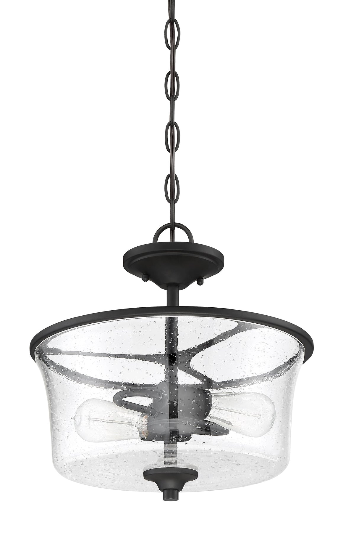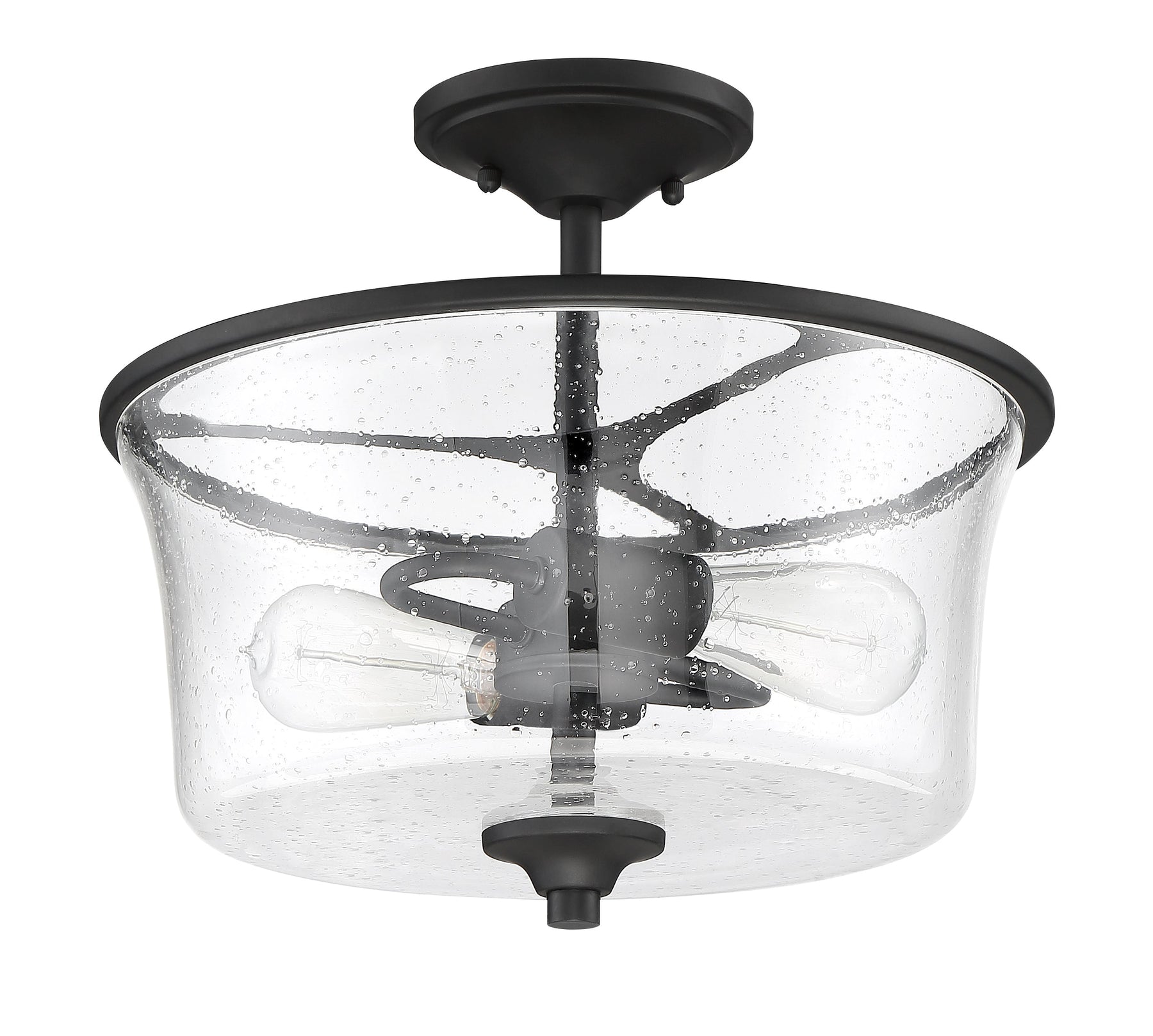 The Gwyneth - 50452-FB Convertible Semi Flush Mount in Flat Black is a sophisticated lighting fixture that enhances any indoor space with its elegant design. It features two medium base bulbs (not included) with a maximum wattage of 60W each. Measuring 13 inches in depth, 13 inches in width, and 15 inches in height, it is perfect for various rooms. The fixture's clear seeded glass shades add a touch of grace, while its 1-year limited warranty ensures quality and durability. With a versatile convertible semi flush mounting method, this indoor-rated light combines style and functionality seamlessly.