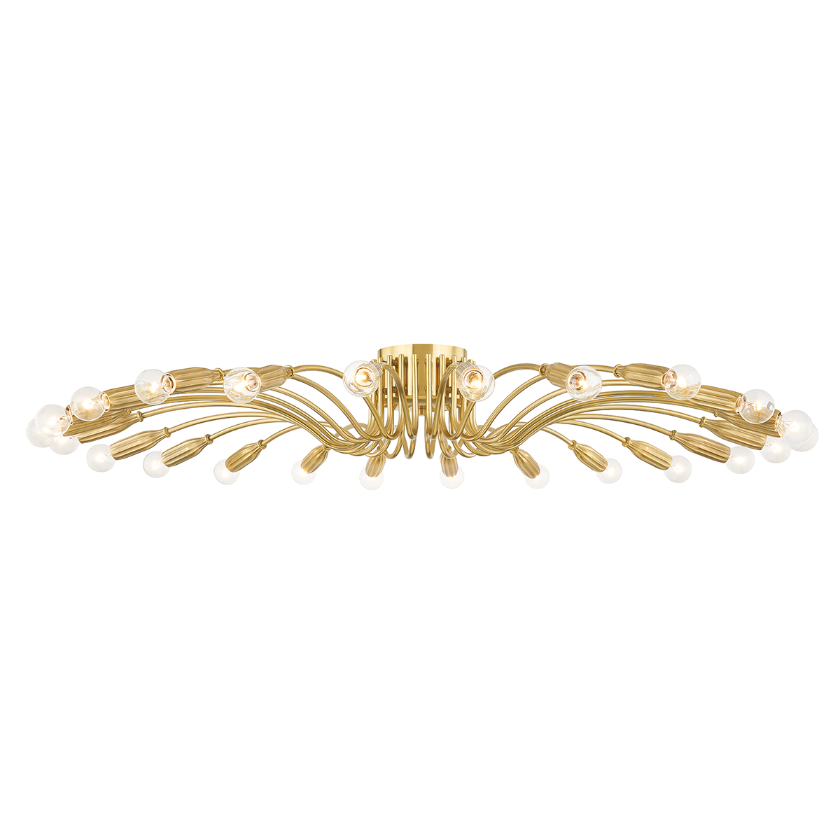 The Barney family pendant by Hudson Valley Lighting is a stunning centerpiece for any space, showcasing a stylish Aged Brass (AGB) finish. With a generous width/diameter of 49.25 inches and a height of 6.50 inches, this fixture features 24 lamps, each accommodating an E12 candelabra base bulb (not included) with a maximum wattage of 8.00W. Though it is not plug-in, the pendant is UL Damp rated, making it suitable for various environments, including areas with occasional moisture.