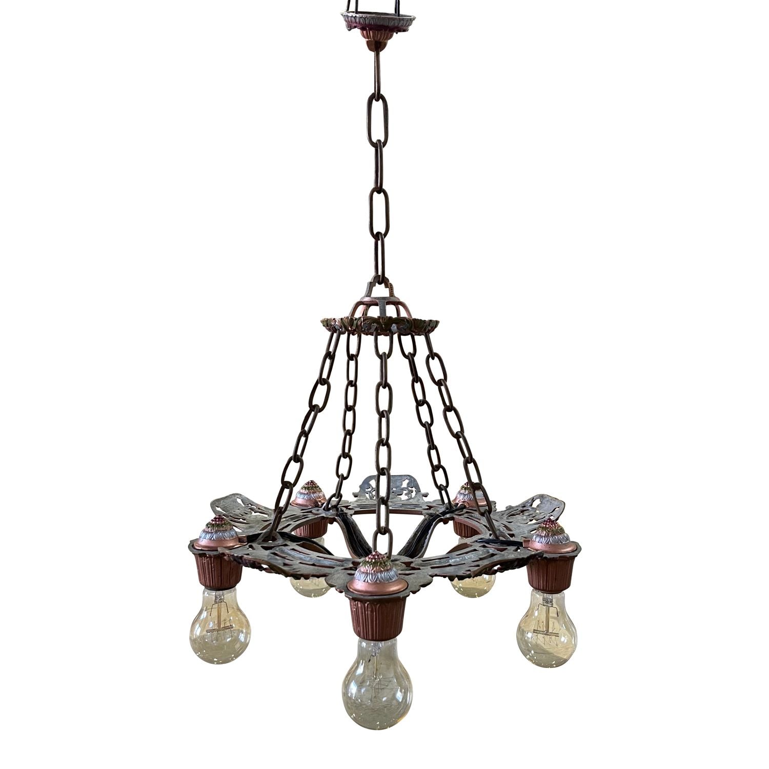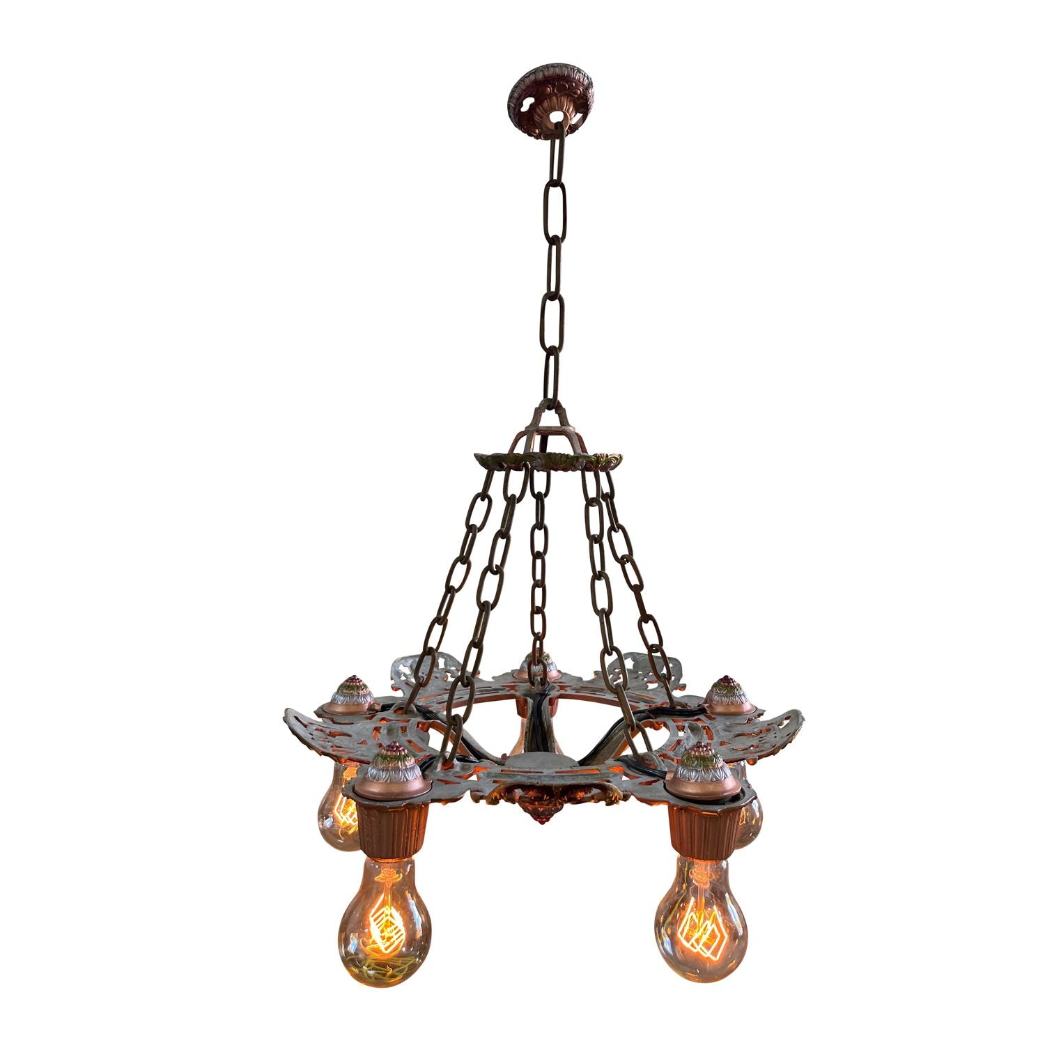 This is an antique five light chandelier made in solid metal. The metal could be a bronze or perhaps some other casting. This chandelier comes with the original patina and has been lightly cleaned and the wiring checked. The ceiling canopy has a nice painted detail.