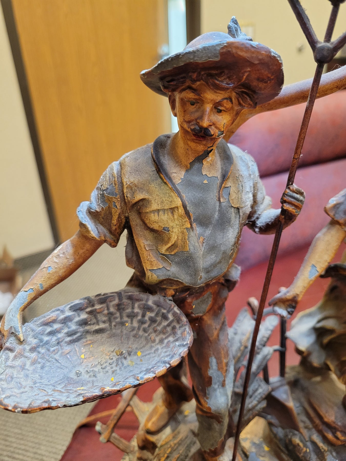 This is an antique table lamp made from spelter metal. This chandelier comes with the original patina and from the pictures you can see how the paint has aged. This table lamp is in fair condition and it has not been rewired. The paint has flaked off in parts of the lamp as shown in the photographs.