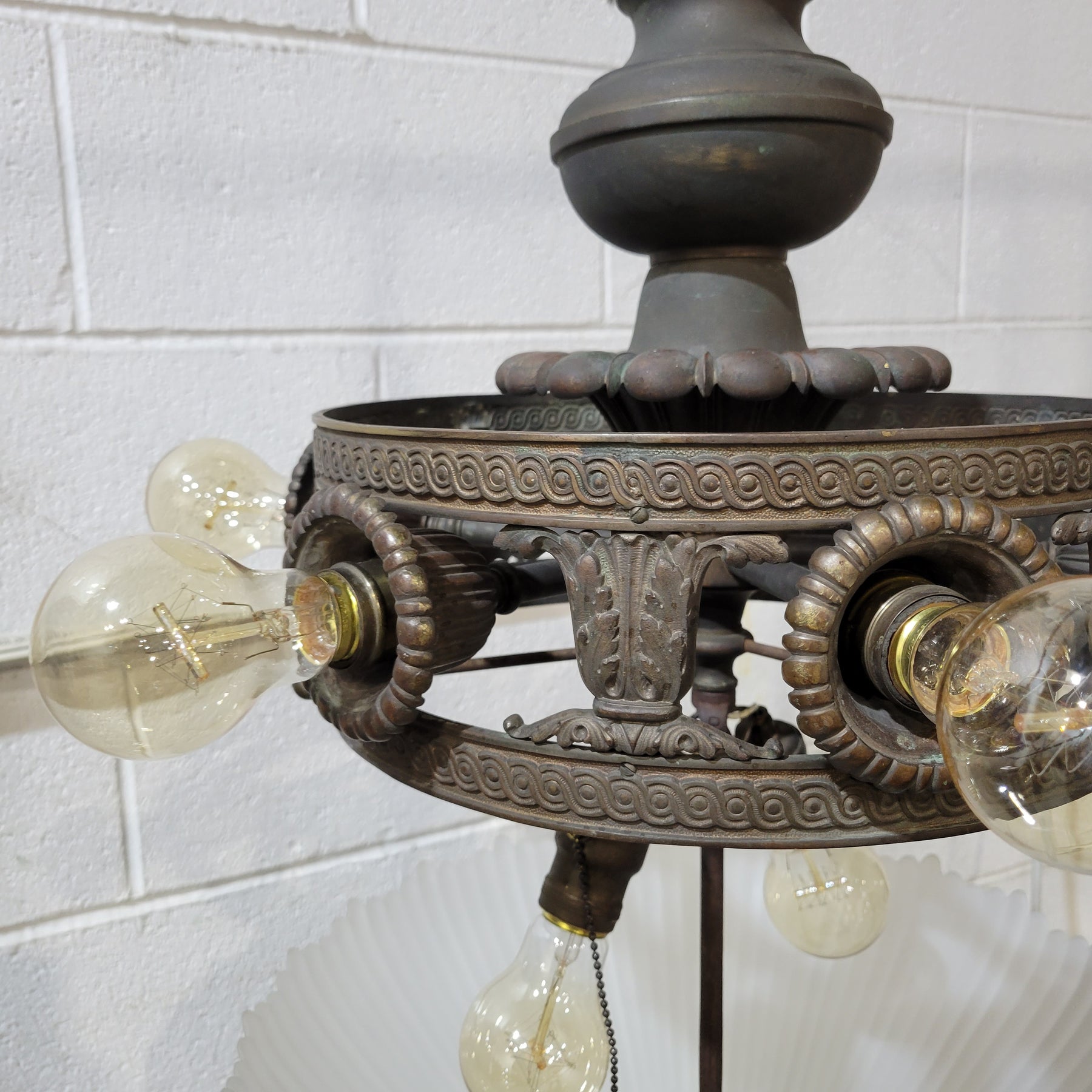 The chandelier measures 16 inches in diameter and it has a 44 inch drop overall. This antique chandelier uses (8) standard E-26 light bulbs (not included). This light has a heavy chain that measures xx inches long.