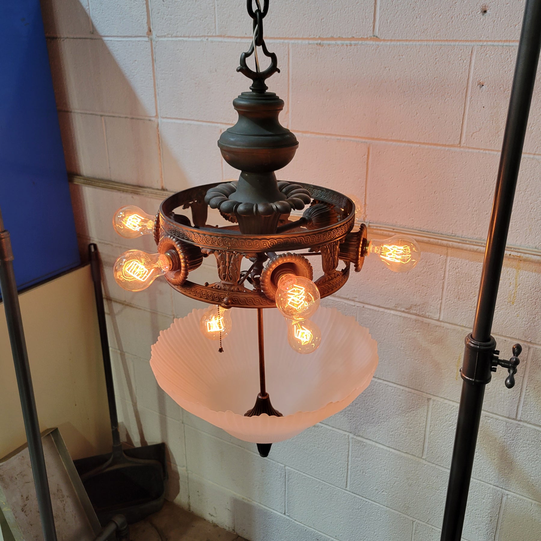 This is an antique 8 light chandelier with the original crystals. This chandelier is in good condition and it has been rewired.