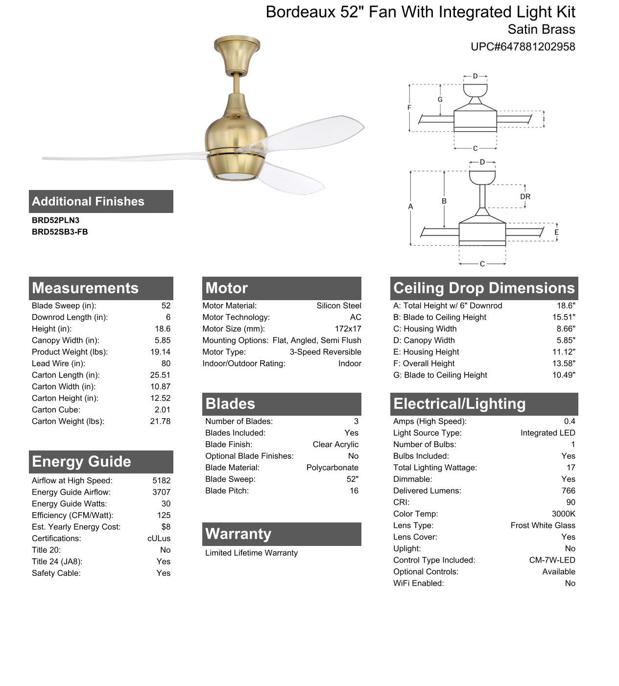 52" Bordeaux in Satin Brass w/ Acrylic Blades