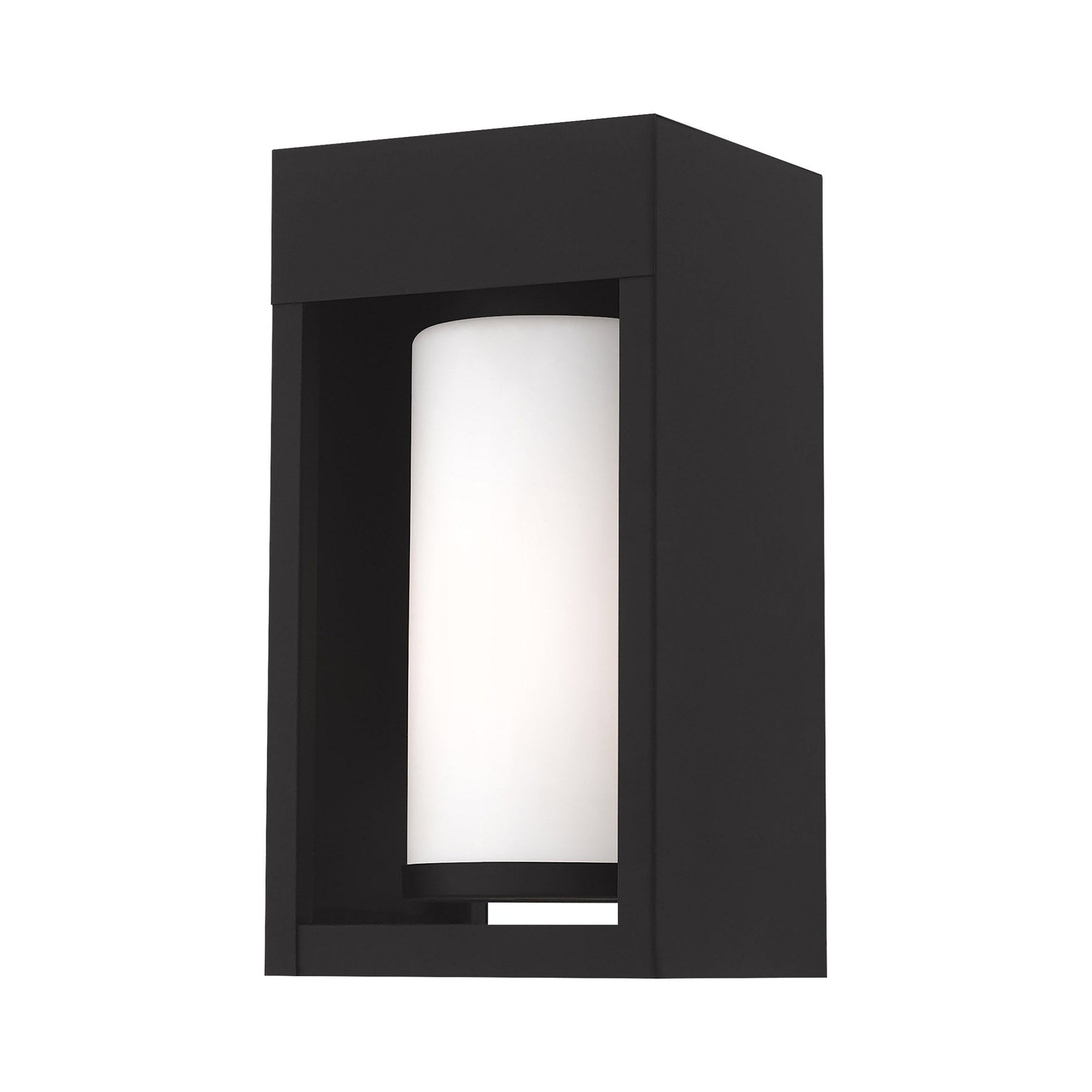 The 20981-04 Bleecker Outdoor Wall Lantern is a perfect blend of modern style and durability. Featuring a solid brass construction, it showcases a striking black finish that enhances its contemporary appeal. This lantern is designed for one medium base bulb with a maximum wattage of 60W (bulb not included) and measures 4.875 inches in width, 9.25 inches in height, and extends 5.25 inches from the wall. Its hand-blown satin opal white cylinder glass shade diffuses light beautifully. Suitable for both damp and wet locations, this handcrafted fixture is ideal for enhancing outdoor spaces.