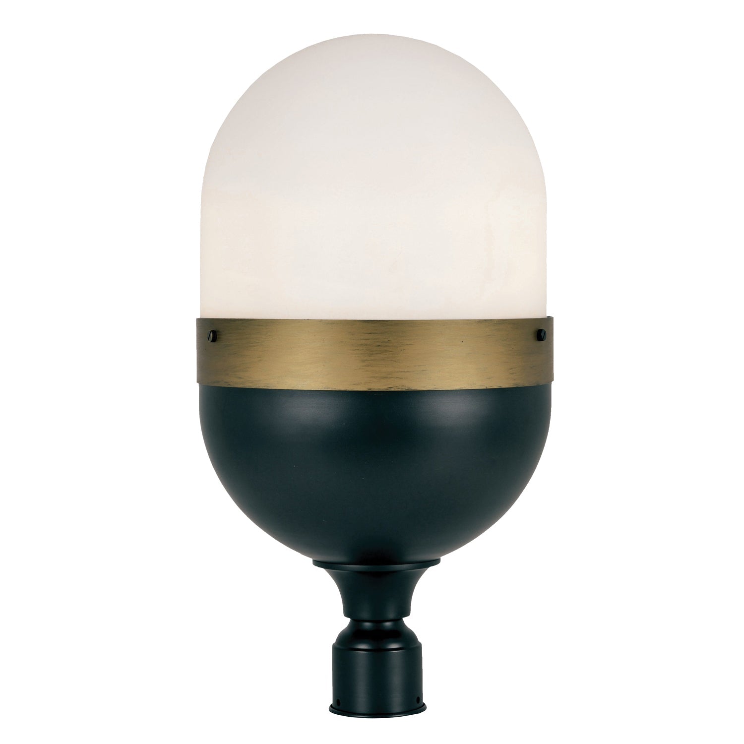 Brian Patrick Flynn's futuristic Capsule Collection adds a touch of industrial grace to front entrances, outdoor chat settings or romantic garden pathways. The egg-shaped design of this outdoor fixture combines a matte black base and opal frosted white glass globe with a distinct, textured gold band. The innovative three-toned design brings instant personality and creates a unique statement for any outdoor space. Capsule can be used outdoors or indoors.