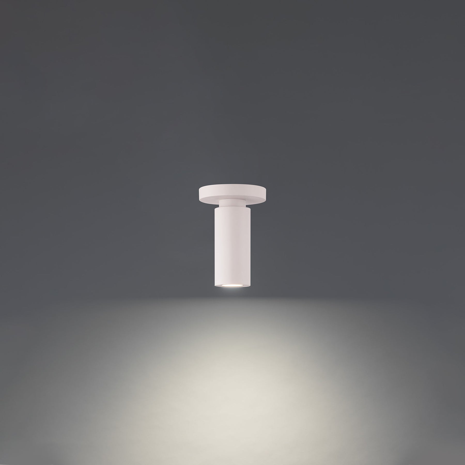 Caliber 5in LED Flush Mount 3000K in White. Light projection tuned with precision. The Caliber outdoor ceiling mount joins a family of wall lights and a single pendant. With cylindrical aluminum body construction and acrylic diffuser, features a clear downward beam of light. Caliber is wet location listed - it can be used indoor or outdoor. This fixture can be mounted only on the ceiling. Universal Input Voltage Driver (120V-240V-277V) concealed in fixture. Smooth and continuous dimming with electronic low voltage 0-10V, ELV,TRIAC dimmer options. High Powered Replaceable LED Module CRI: 90, Rated Hours: 50000, Color Temp: 3000K Standards: ETL & cETL UL 1598 listed with IP65 rating for Wet Locations. CEC Title 24 compliant.