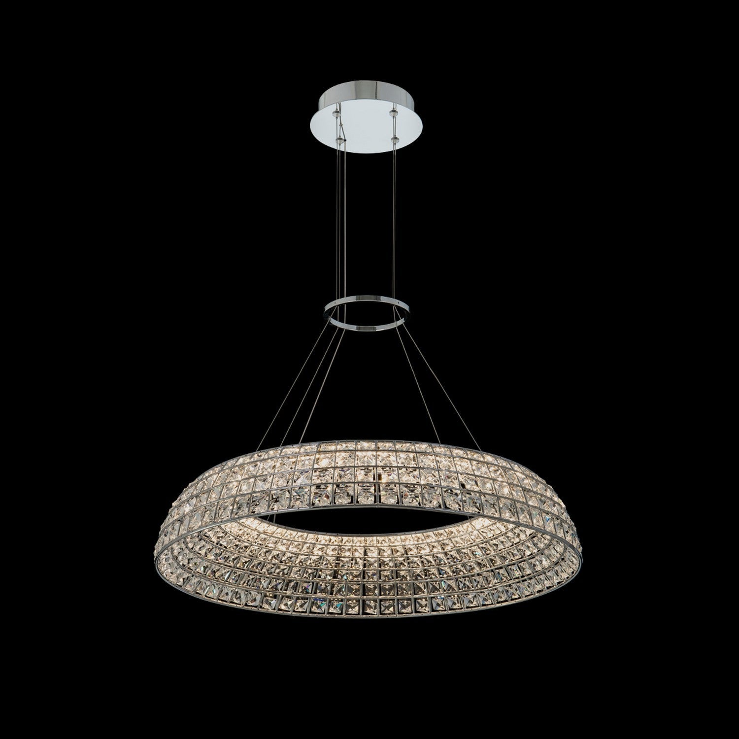 The Nuvole 28? LED Pendant is a stunning addition to any indoor space, featuring a modern casual luxury design. Crafted from high-quality steel and clear Firenze crystal, it exudes elegance with its polished chrome finish. This pendant light boasts a generous dimension of 28 inches in diameter and 5 inches in height, suspended by cables measuring 96 inches in length. It requires LED bulbs (included), with a total wattage of 48 and a lumens output of 4320 at 3000 Kelvins. Dimmable with an ELV dimmer, the fixture is energy-efficient and hardwired for a seamless installation. With a UL-ETL safety rating and a weight of 27 pounds, the Nuvole pendant is perfect for enhancing the ambiance of your home.