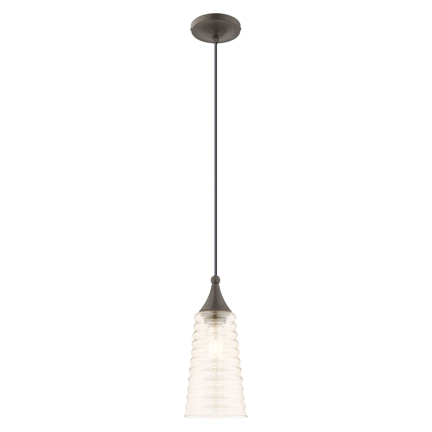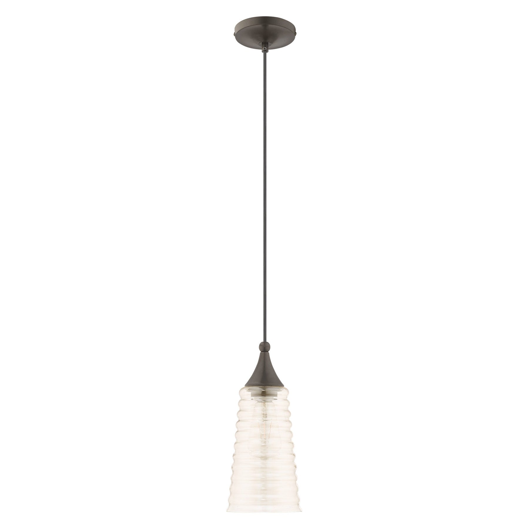 The 40648-92 Art Glass Mini Pendant in English Bronze is a stunning contemporary lighting fixture that enhances any space with its retro charm. This mini pendant features a beautiful champagne ribbed glass shade that refracts light for a soft, inviting glow. It has a height adjustable between 13.5 inches and 80 inches and a diameter of 5.5 inches, making it versatile for various room sizes. The fixture accommodates one medium base bulb (not included) with a maximum wattage of 60W. With a 4.75-inch canopy, it's perfect for sloped ceilings and rated for damp locations, ensuring it can be used in various settings.