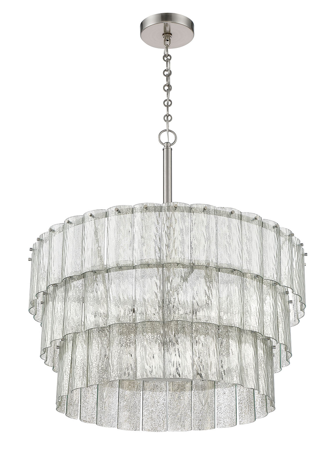 Simply put, our Museo lighting collection is a work of art. Finished in your choice of brushed polished nickel or satin brass, these tiered, antiqued mercury glass chandeliers give Museo the illusion of fluidity.