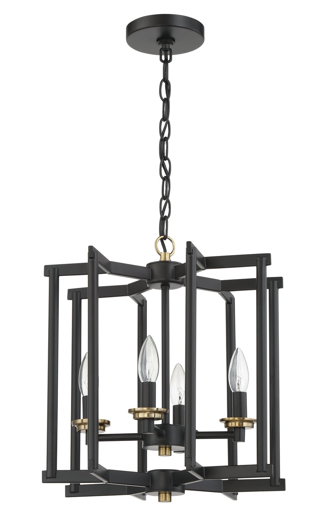 The Avante Grand 4 Light Cage Foyer in Flat Black/Satin Brass is a stunning illumination choice for enhancing any indoor space. This foyer light features a sophisticated design with a sleek Flat Black finish complemented by elegant Satin Brass accents. It requires four E12 candelabra base bulbs (not included), each with a maximum wattage of 60W. With dimensions of 14 inches in depth, 14 inches in width, and 16 inches in height, it provides substantial presence while maintaining versatility for various decor styles. The fixture is chain hung and includes a generous 6FT chain, making it suitable for different ceiling heights. Additionally, it is UL Damp rated, ensuring safety and reliability for indoor use.