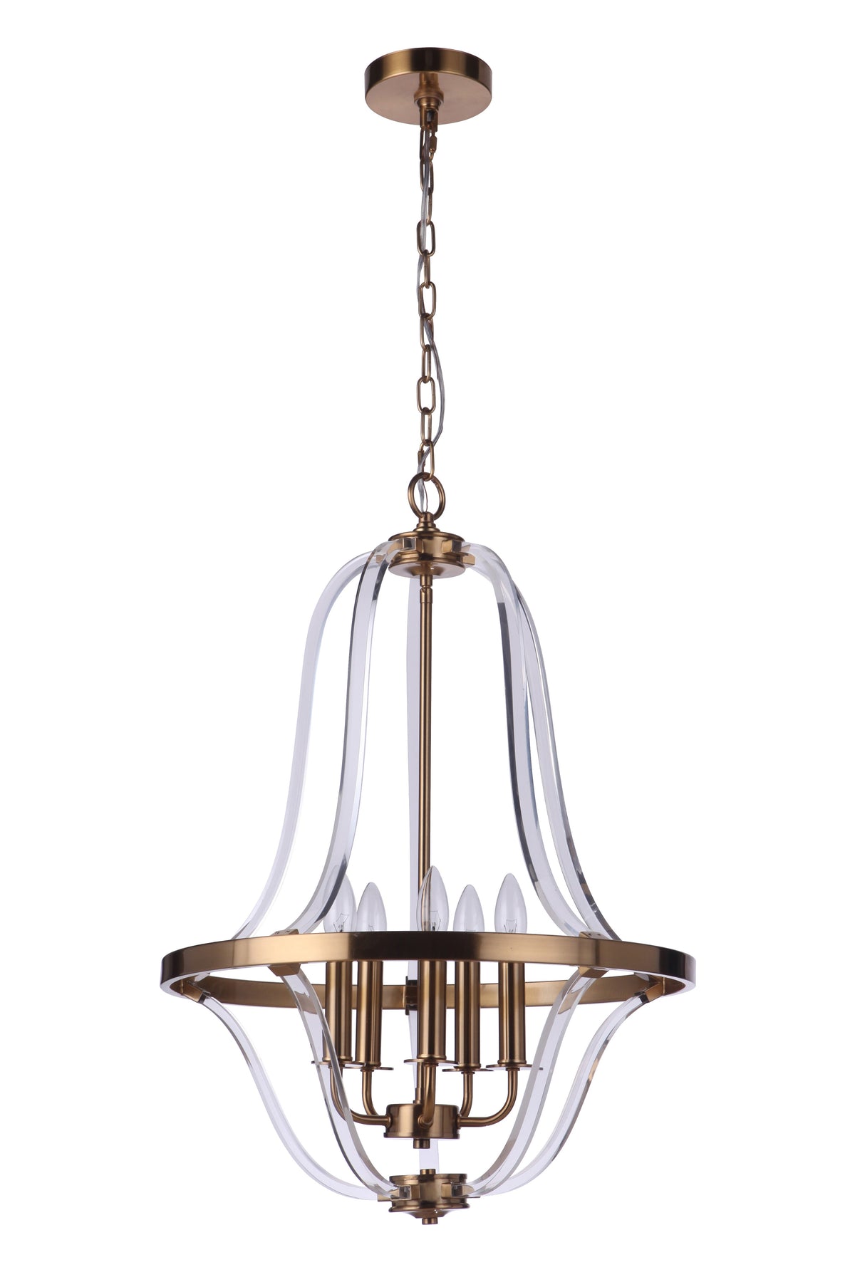 The Graclyn 5 Light Foyer in Satin Brass is a stunning addition to any entryway or living space, showcasing elegant lines of clear acrylic complemented by a rich satin brass finish. This foyer light requires five E12 candelabra base bulbs (not included) with a maximum wattage of 60W each. With dimensions of 19.50 inches in depth, 19.50 inches in width, and 28.30 inches in height, it is designed for easy installation with a 6FT chain and is damp rated, making it suitable for moisture-prone areas. Enhance your home decor with this stylish and functional lighting fixture.