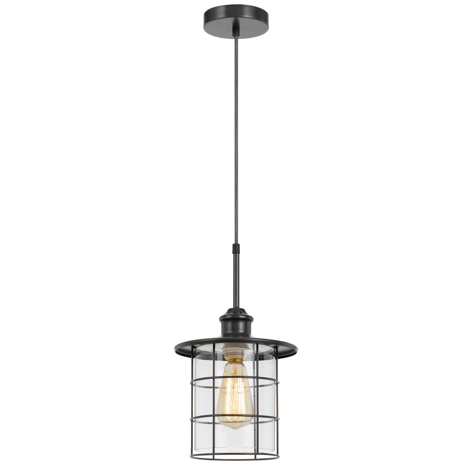 The FX-2668-1P Silverton metal and glass pendant fixture combines durability with style, making it an excellent addition to any industrial-themed space. It features a clear glass shade in a lantern design and a unique cage structure, perfect for showcasing Edison bulbs (included). The customizable 72-inch cord allows for flexible hanging heights, and the canopy is included for easy installation. This single light pendant operates on a maximum wattage of 60W and requires an E26 bulb base. With minor assembly required and a one-year warranty against defects, this pendant light offers both functionality and flair.
