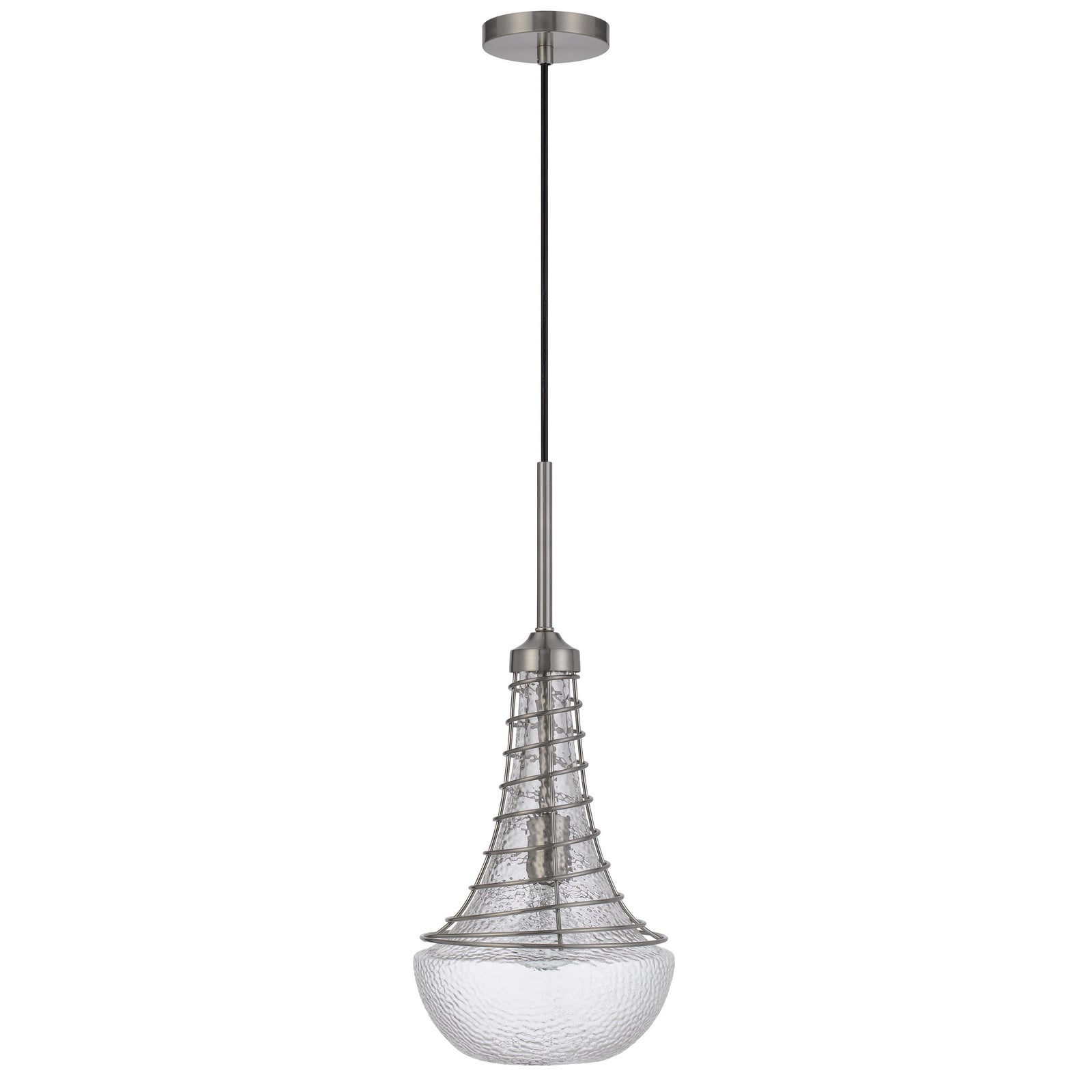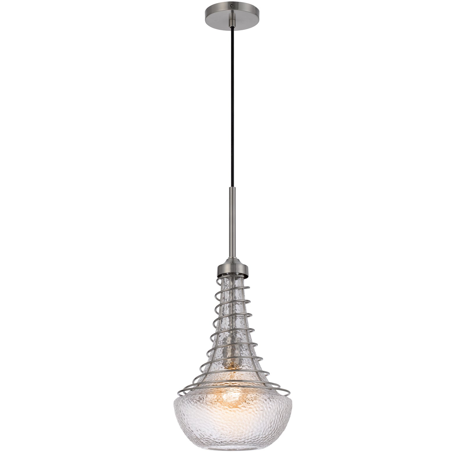 The FX-3130-1 60W Baraboo metal/glass mini pendant is a perfect blend of durability and aesthetic appeal. Featuring a robust glass and metal construction, this pendant showcases a decorative metal wire corkscrew accent that adds a unique touch to your decor. It includes 6 feet of cord for flexible installation and comes with a canopy for a complete setup, all shipped in one carton. The pendant is designed with clean, smooth lines and textured glass, making it a wonderful addition to any room. It requires a single E26 base bulb with a maximum wattage of 60W and is assembled with ease. This product ships within 3 business days and is backed by a one-year warranty against defects.