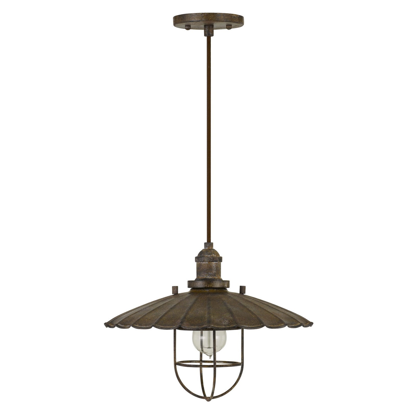 The FX-3725-1P Olive Old Industrial Metal Pendant with Glass Shield is a striking addition to any space, showcasing a durable metal construction in a rustic finish. With a height of 10.5 inches and a charming decorative grill bulb shield, this pendant light blends vintage appeal with modern utility. It includes a 4.75-inch canopy and a 6-foot cord, making it versatile for various ceiling heights. Designed for one E26 base bulb (not included), this fixture supports a maximum wattage of 60W and requires minor assembly. It ships in one carton, and comes with a one-year warranty, ensuring a lasting quality in your home décor.