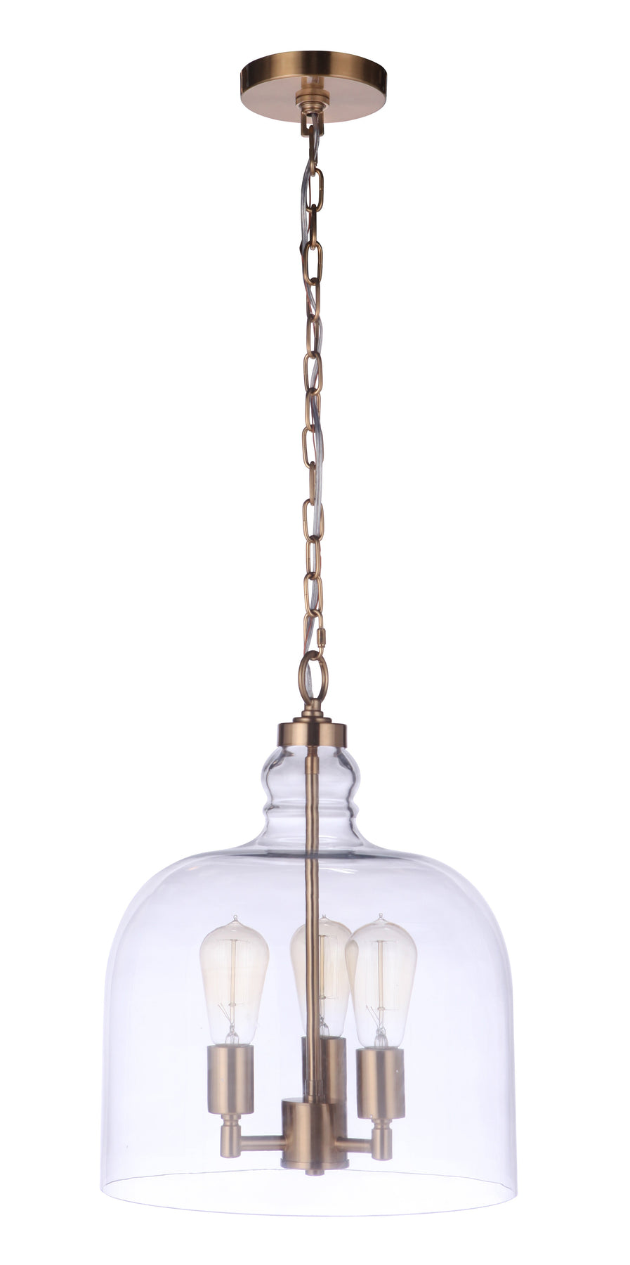 The Jackson 3 Light Pendant in Satin Brass is a stunning addition to any space, showcasing a large clear glass dome that elegantly houses three medium base 60 watt bulbs (not included). With dimensions of 13.63 inches in depth and width, and a height of 17.50 inches, this pendant is perfect for illuminating dining areas and living rooms. It features a 6FT chain for hanging, is damp-rated for versatility in different environments, and comes with a 1-year limited warranty for peace of mind.
