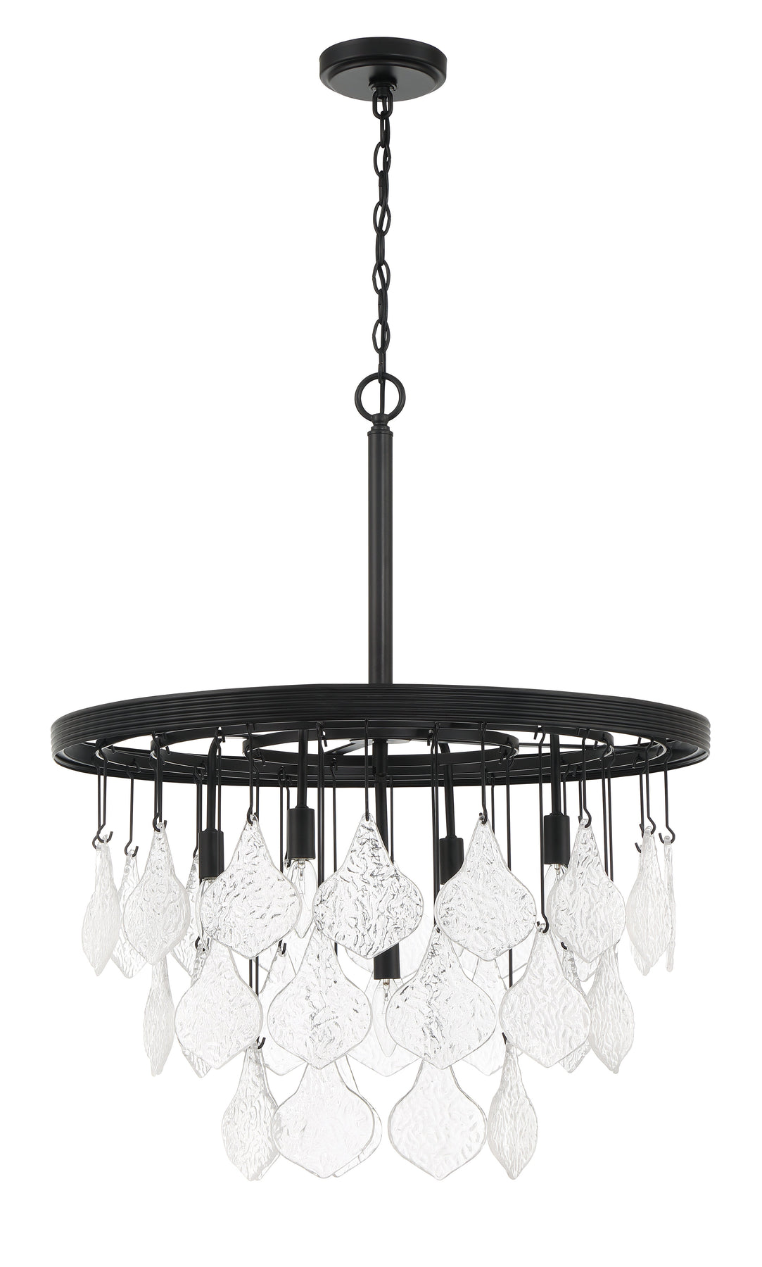 The Vesi 5 Light Pendant in Flat Black is a stunning centerpiece that brings elegance to any indoor space. This pendant features a striking design with rings of clear textured glass crystals surrounding five E12 candelabra base bulbs (not included), each with a maximum wattage of 60W. Measuring 26 inches in both depth and width, and standing 32 inches tall, it includes a 6FT chain for easy hanging. The pendant is rated for indoor use and comes with a 1-year limited warranty, ensuring quality and satisfaction.