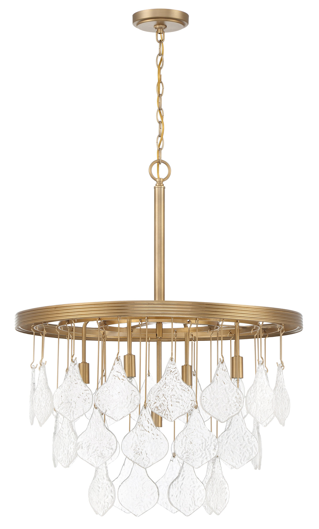 The Vesi 5 Light Pendant in Satin Brass is a stunning addition to any indoor space, featuring elegant rings of clear textured glass crystals that surround a cluster of five candelabra base bulbs (not included). With a generous dimensions of 26 inches in both width and depth, and a height of 32 inches, this pendant is ideal for creating a captivating waterfall-inspired look. It includes a 6-foot chain for hanging and operates on 120V/60Hz, ensuring a stylish yet functional lighting solution. The pendant is safety rated cETLus and comes with a 1-year limited warranty, making it a reliable choice for your home.