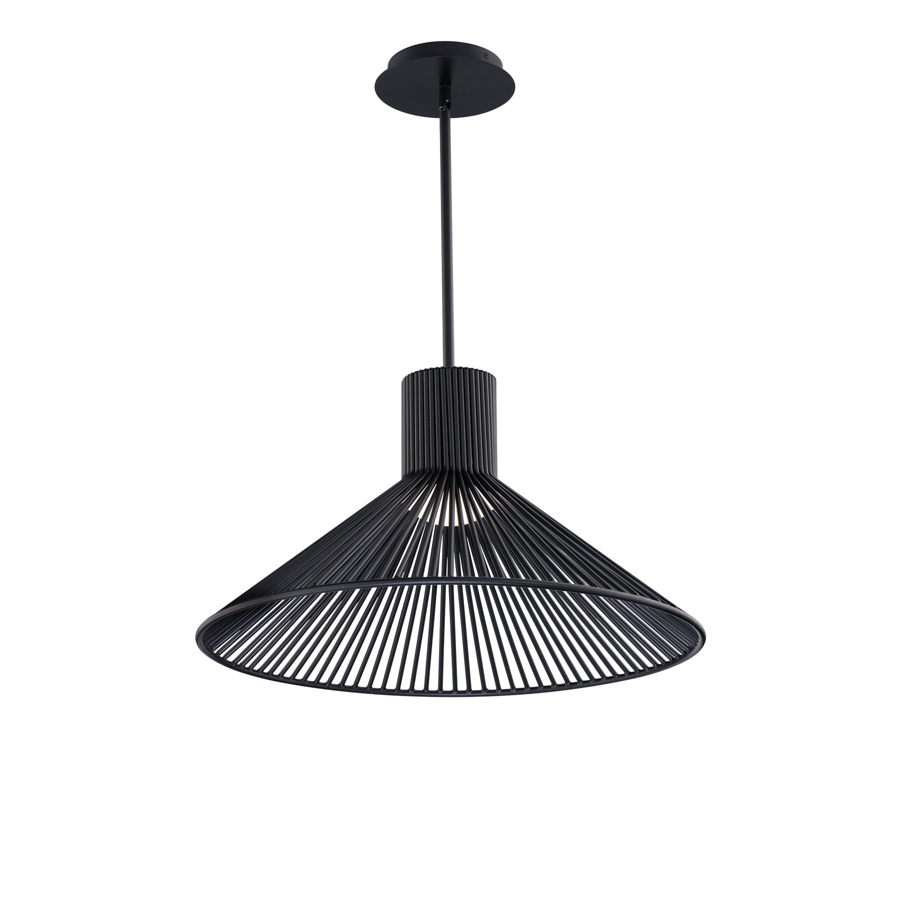 Cappe 21in LED Pendant 2700K in Black. A crown of narrow rods descends into a wide brim. The clean, basket-style frame shelters LEDs that shine both out and down. Featuring aluminum construction with an acrylic diffuser Includes three 12in and one 6in� downrods included (additional downrods available). Sloped ceiling compatible. Driver is located in the canopy and installs within a junction box. Smooth and continuous dimming with an electronic low voltage (ELV), or TRIAC dimmer. High Powered Replaceable LED Module CRI: 90, Rated Hours: 50,000, Selectable Color Temp: 2700K-3000K-3500K-4000K Standards: ETL & cETL UL 1598 listed for Damp Locations.