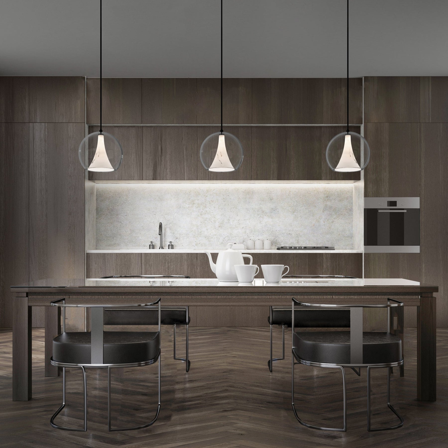 Chantilly 14in LED Pendant 3000K in Black. An unexpected first impression. Glowing alabaster captured within a clear crystal globe. Features aluminum construction, with a faux alabaster downlight interior and clear glass ball exterior 10ft of wire included to extend up to a maximum of 120in. Three 12in and one 6in downrods included (additional downrods sold separately). Universal Input Voltage Driver (120V-240V-277V) concealed within the canopy. Custom CCT options available by special order. Smooth and continuous dimming with an electronic low voltage (ELV) or TRIAC dimmer. High Powered Replaceable LED Module CRI: 90, Rated Hours: 50,000, Color Temp: 3000K Standards: ETL & cETL UL 1598 listed for Damp Locations.