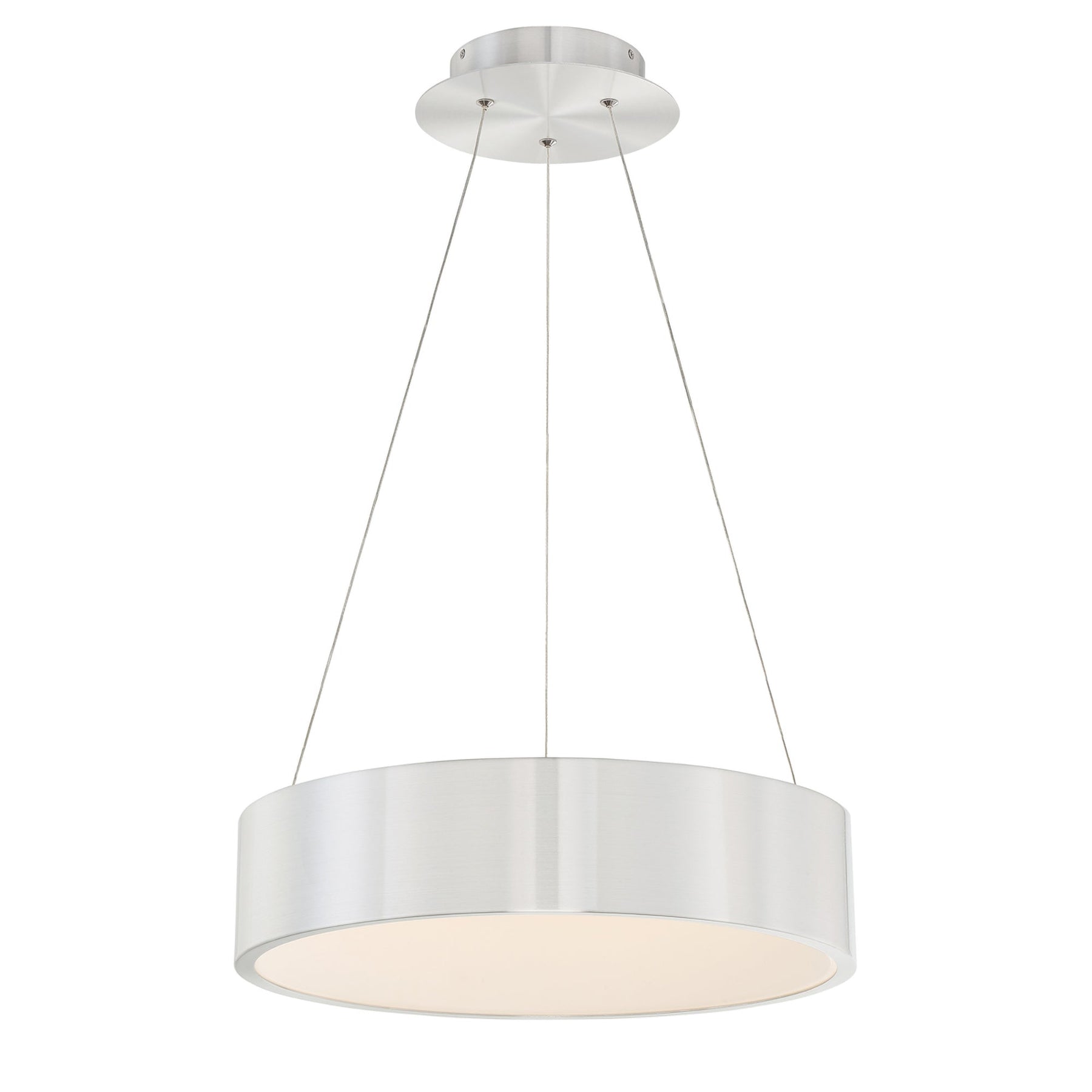 Corso 18in LED Pendant 3000K in Brushed Aluminum. Cleverly hidden LED modules and a circular frosted diffuser floating inside a halo of spun aluminum work together for a beautiful, even illumination. Note the two new finishes—white and black—along with the original aluminum. Energy efficient integrated LED's provide a long-lasting maintenance-free bright and even illumination. 10ft of wire included to extend pendant up to a total of 120in, adjustable through a push-pin locking mechanism at the canopy. Solid aluminum construction with a white PC diffuser for maximum brightness and even illumination. Can be mounted on a slope ceiling. 10ft of wire included to extend pendant up to a total of 120in, adjustable through a push-pin locking mechanism at the canopy. Can be mounted on a slope ceiling. Driver is located in the round canopy. Universal Input Voltage Driver (120V-240V-277V). Custom CCT options available by special order. Smooth and continuous dimming with an electronic low voltage (ELV) or 0-10V dimmer. High Powered Replaceable LED Module CRI: 90, Rated Hours: 83,000, Color Temp: 3000K Standards: ETL & cETL UL 1598 listed for Damp Locations. CEC Title 24 Compliant.