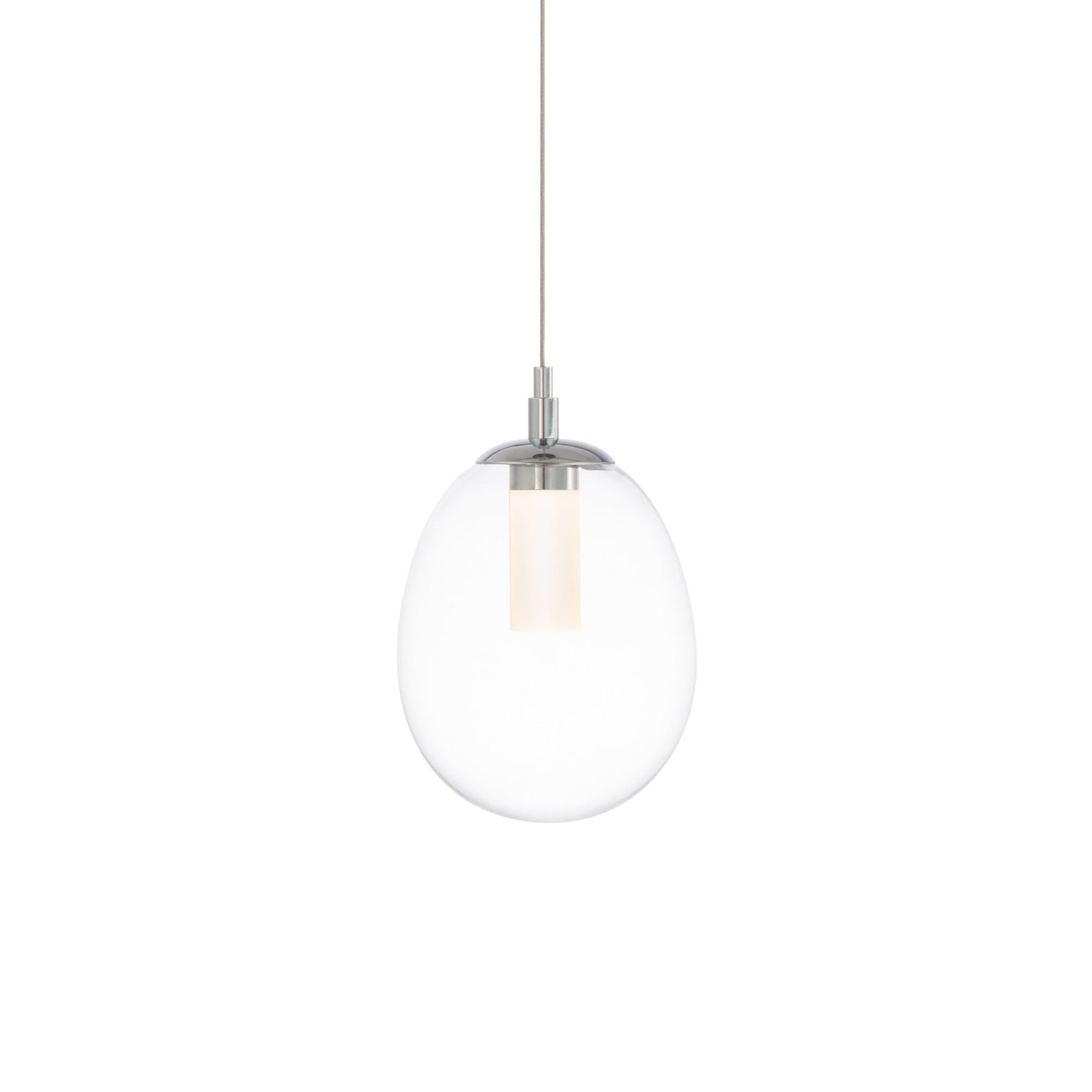 Bolla 5.9in LED Mini Pendant 3000K in Chrome. A unique oval glass pendant defined by the drama and charm of uptown chic. The modern oval orb appears to be floating in air with unobtrusive electrified aircraft cables and complemented with a chrome finish. Suspend individually or in groups to make a stunning design statement above a kitchen island, dining table, retail counter or bar. This mini LED pendant with a 5 inch diameter illuminates with LEDs that feature a high 90 color rendering index and a CCT of 3000 Kelvin. Bolla operates on a 120-220-277V universal input voltage driver. The LEDs have a 50,000 hour rated life. This LED luminaire is ETL and cETL listed for damp locations and it is California Title 24 rated for the highest energy efficient requirements today. Dims down nicely with an electronic low voltage or TRIAC dimming system. Featuring steel construction with an internal etched acrylic diffuser surrounded by a clear glass diffuser for a clean and modern look. Bolla is damp location listed - can be used indoor or covered outdoor areas. Ultra-sleek electrified cables eliminate the need for clunky power wires. Height is simple to adjustable with 120in of cable through push pin connectors at the canopy. Longer lengths can be special ordered. Universal Input Voltage Driver (120V-240V-277V) concealed in fixture. Sloped ceiling compatible. Smooth and continuous dimming with electronic low voltage ELV or TRIAC dimmer options. High Powered Replaceable LED Module CRI: 90, Rated Hours: 50000, Color Temp: 3000K Standards: ETL & cETL UL 1598 listed with IP44 rating for Damp Locations. CEC Title 24 compliant.