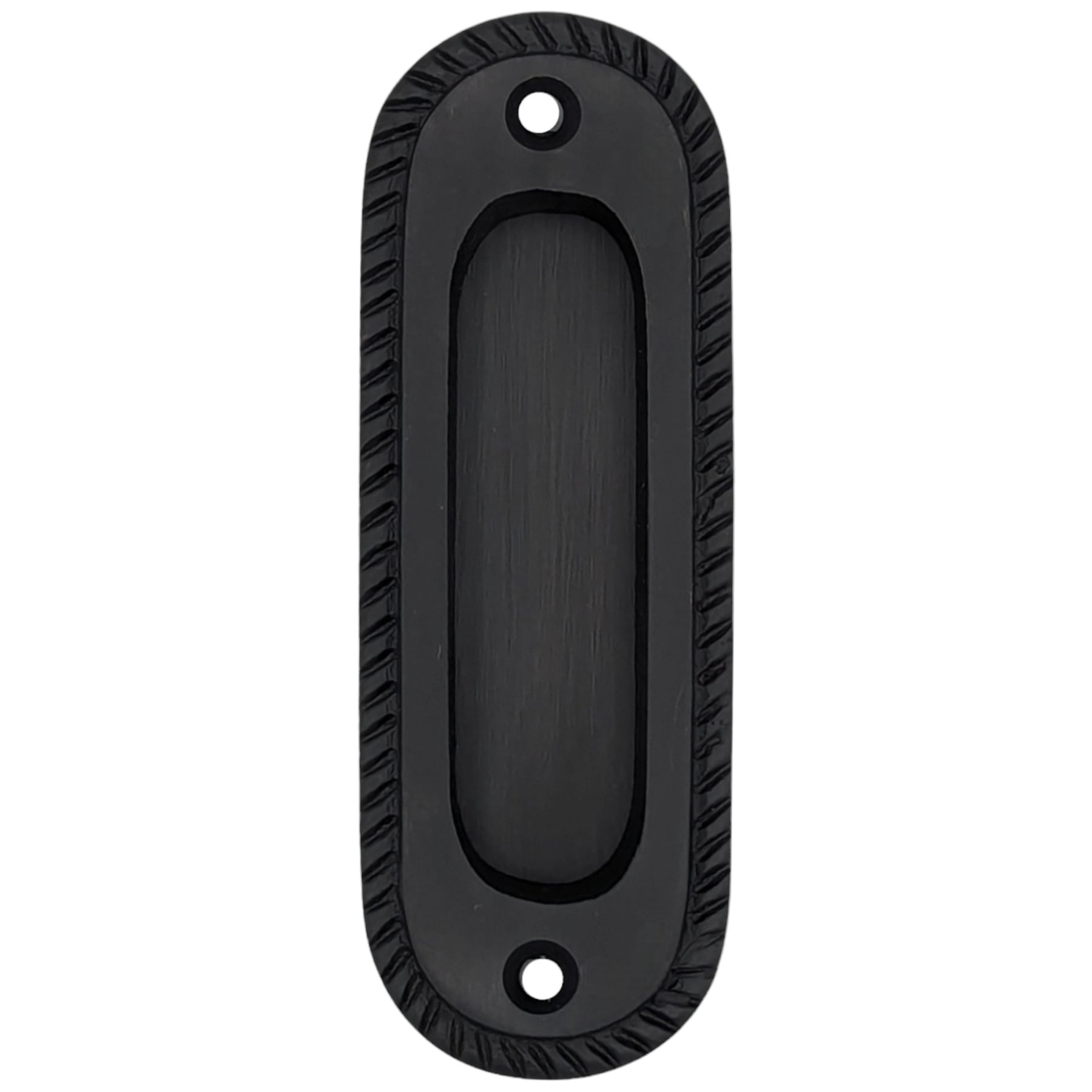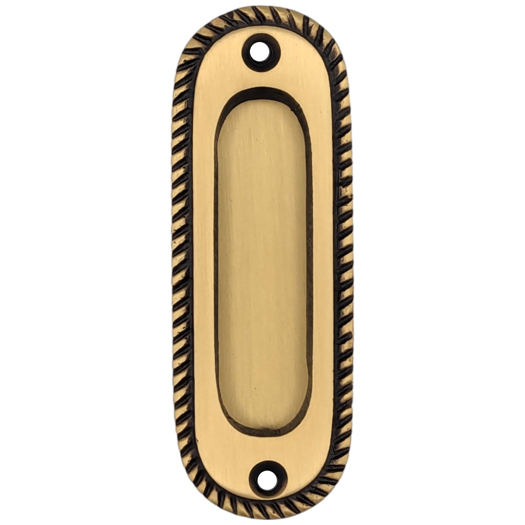 The flush pull measures approximately 4 inches tall by 1 2/5 inch wide. The piece is crafted from solid brass, this detailed hardware piece comes complete with complementary screws, ensuring easy installation with all the necessary mounting hardware included. For a flush finish, routing may be necessary.
