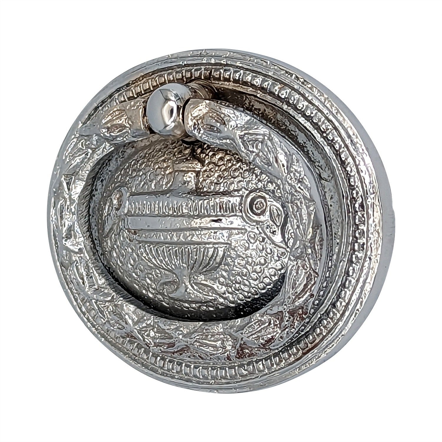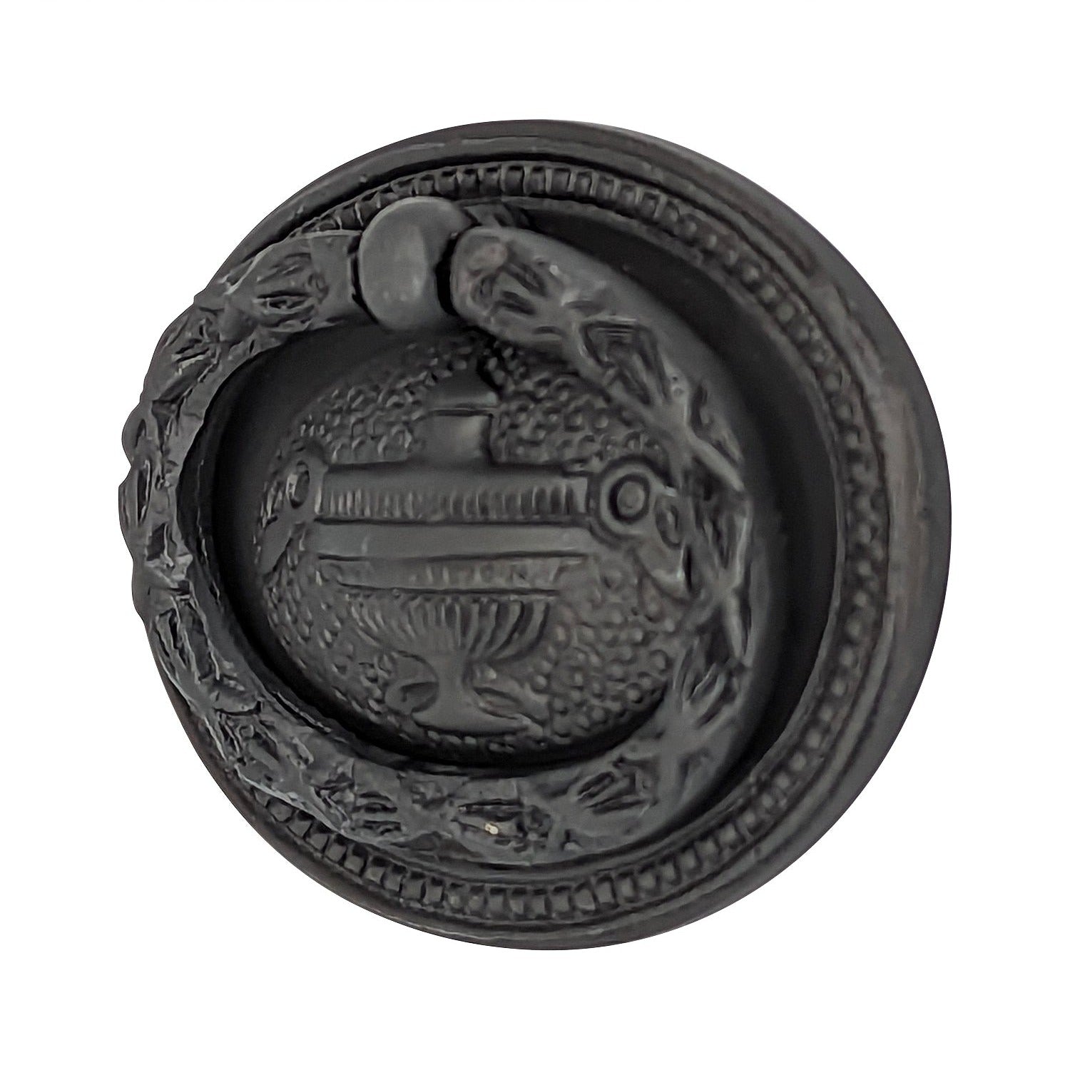 This ring pull measures 2 7/8 inches long and 2 1/8 inches tall. Comes complete with one rear mount machine screw. This oval bail pull is made in the Hepplewhite and Federal (Federalist) style and it is available in several finishes. Comes complete with mounting hardware.