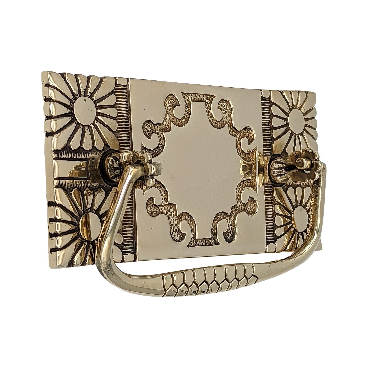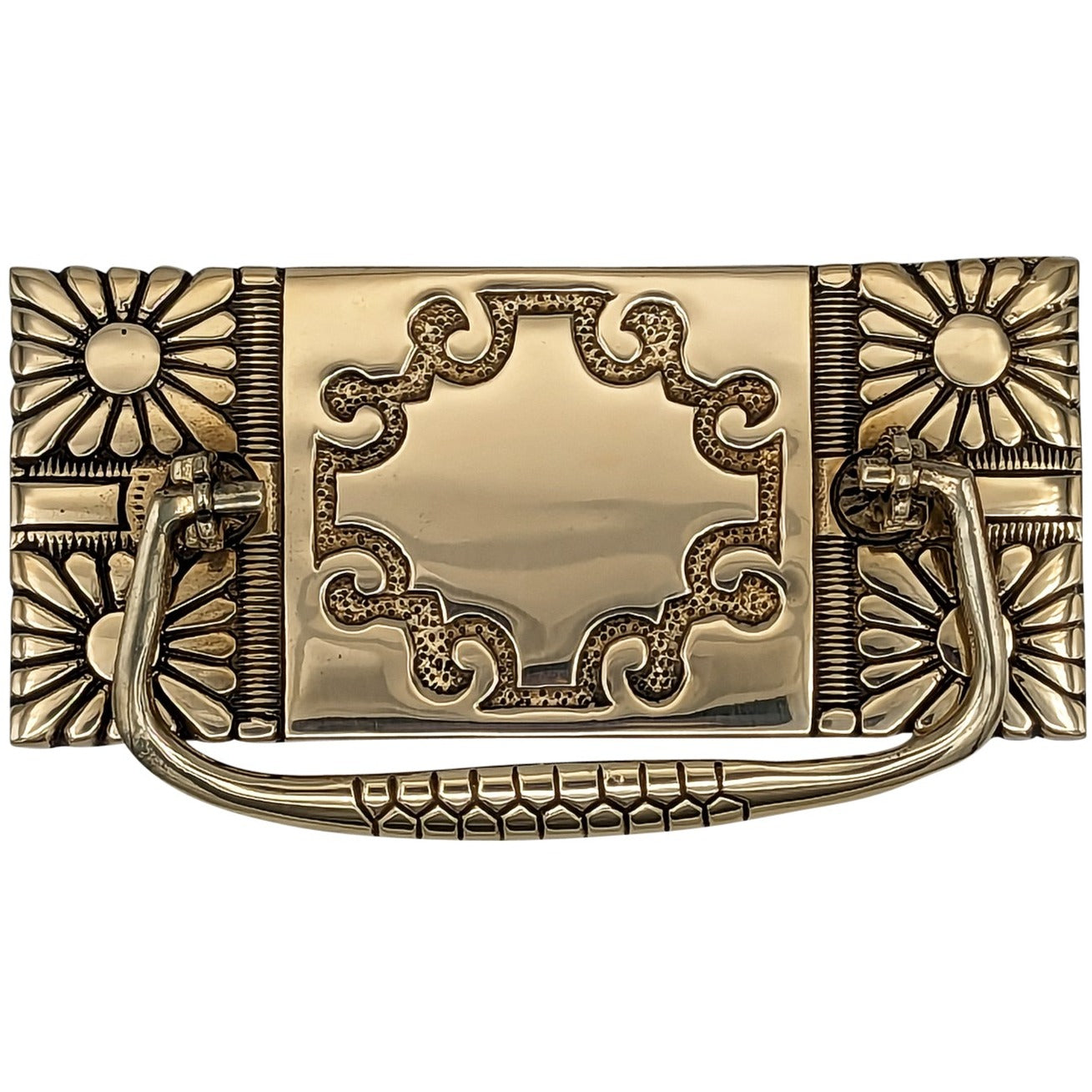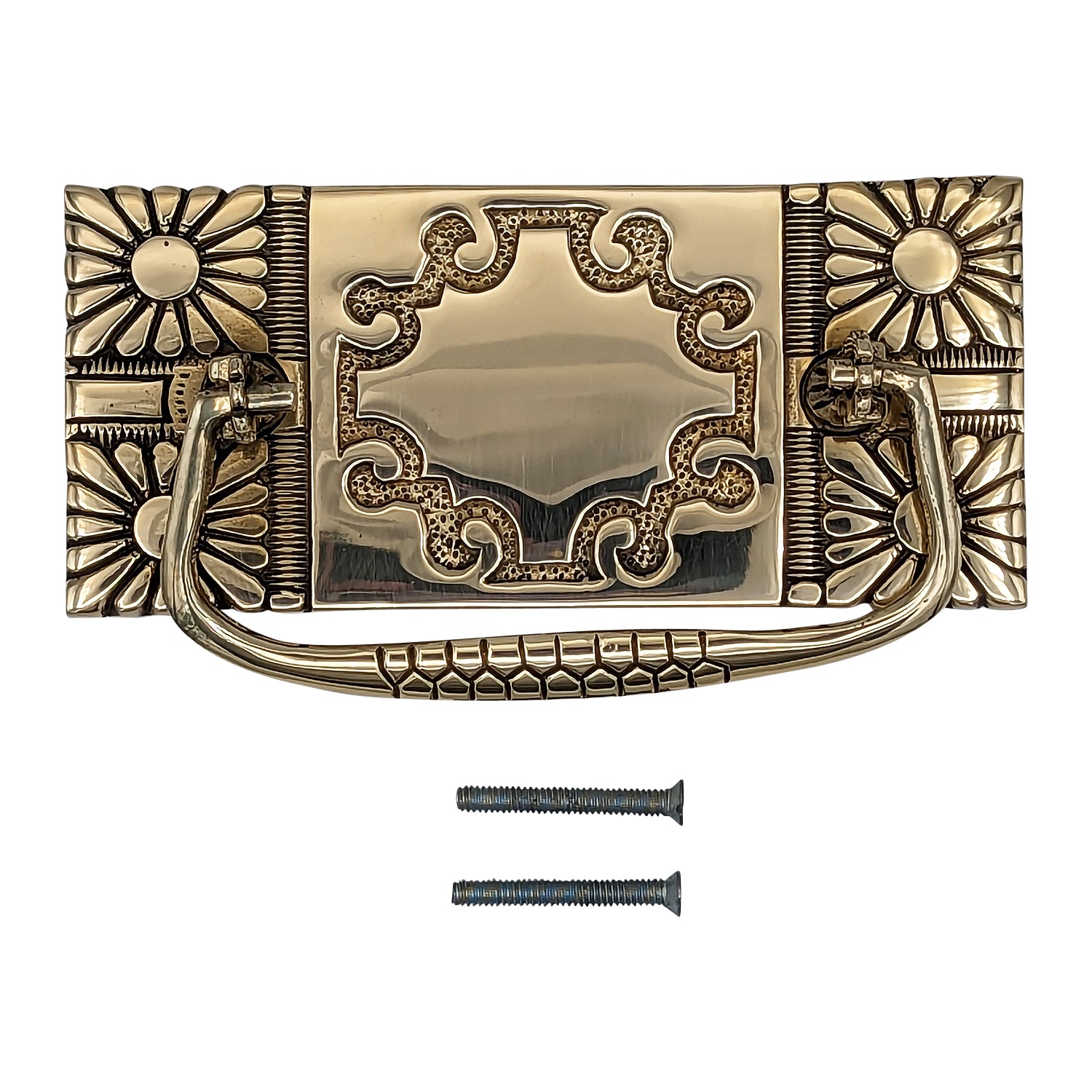 This Pull Plate measures 5 1/8 inches long and 2 1/4 inches tall. Center to center mounting distance is 3 1/8 inches. Highly ornate and hand finished detailing. This bail style pull has a projection of approximately 2 1/8 inches. Comes complete with mounting hardware. This particular product has a lead time of approximately 1 to 3 business days.