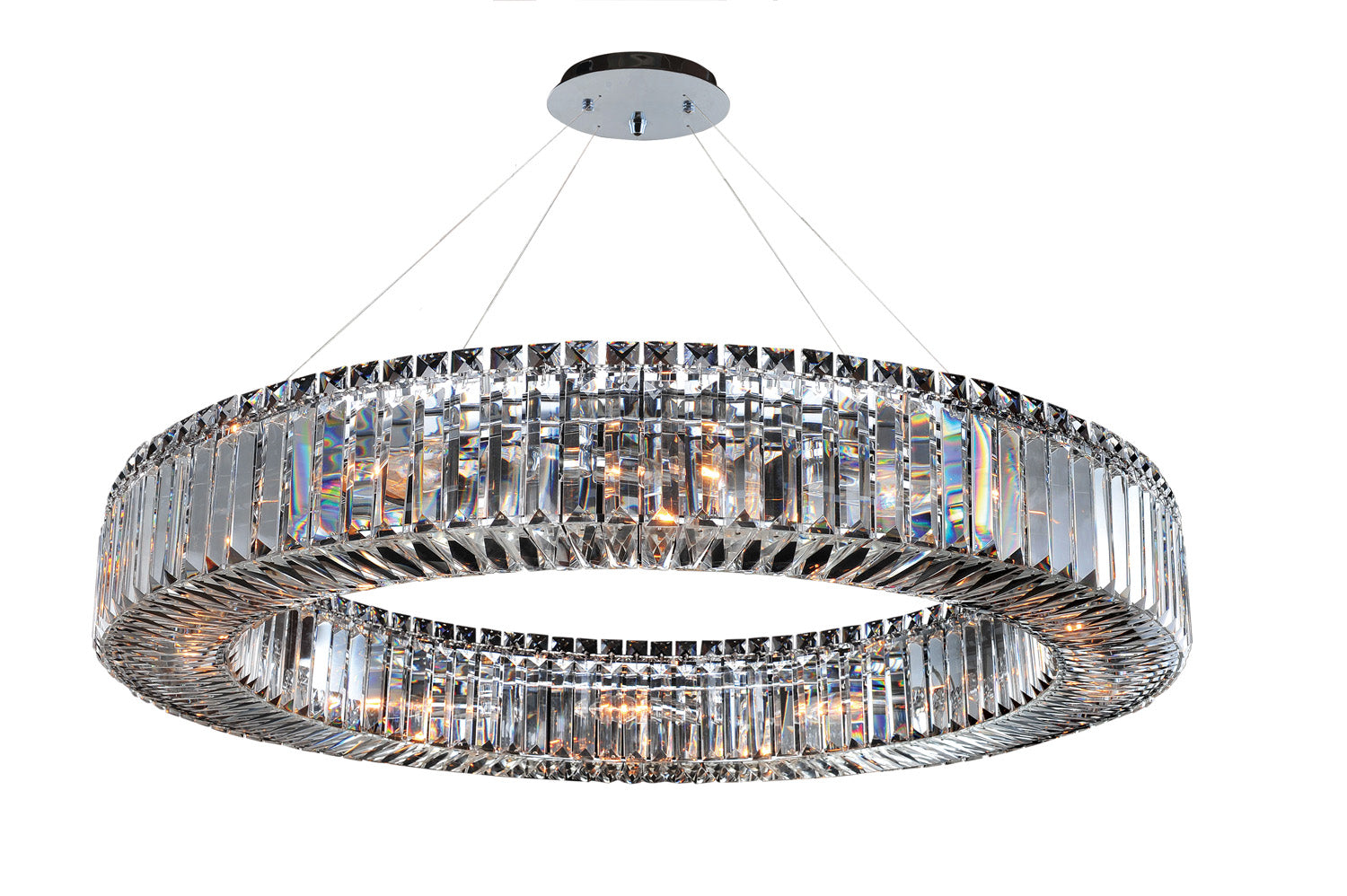 The Rondelle 35.5 Inch Pendant from the Rondelle Collection is a stunning addition for those who appreciate modern classic design. Crafted from laser-cut stainless steel, this pendant features a polished chrome finish that beautifully complements the crystal clear Firenze accents. Measuring 36 inches in diameter and 5 inches in height, it hangs elegantly from a 96-inch cable suspension, making it ideal for various indoor settings. This pendant requires 12 E12 candelabra base bulbs (not included), with a maximum wattage of 40W, and is dimmable, allowing you to create the perfect ambiance. Its UL – ETL safety rating ensures peace of mind in your home.