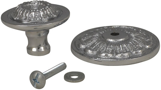 This brass knob measures 1 1/2 inches in diameter with a projection of 1 1/8 inches. Mount is 2 inches in diameter with ornate floral carving. Comes complete with the mounting screw. Available in Polished Chrome, Polished Nickel, Brushed Nickel, and Matte Black finishes. The average lead time of this particular product is 1 to 3 Business Days.