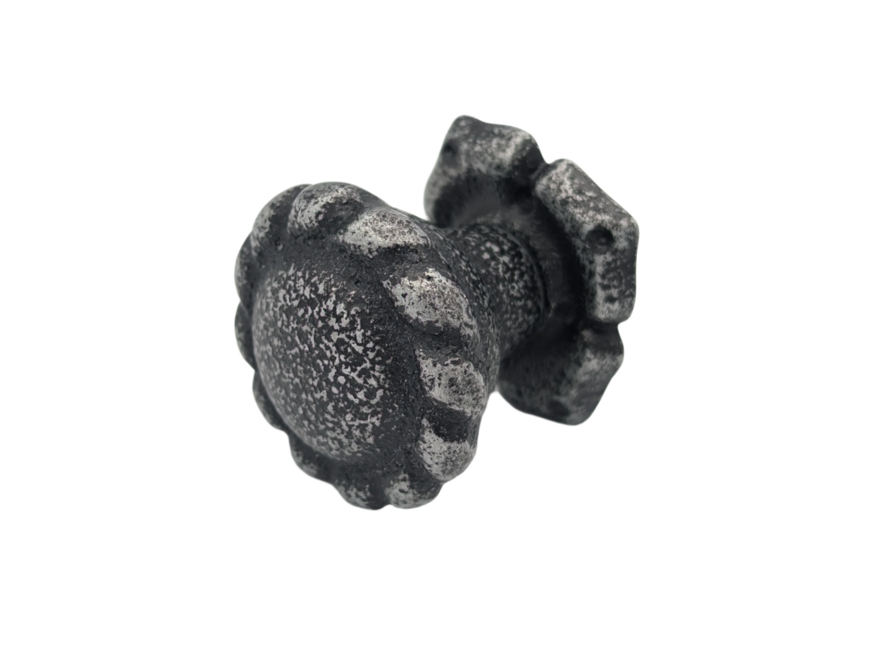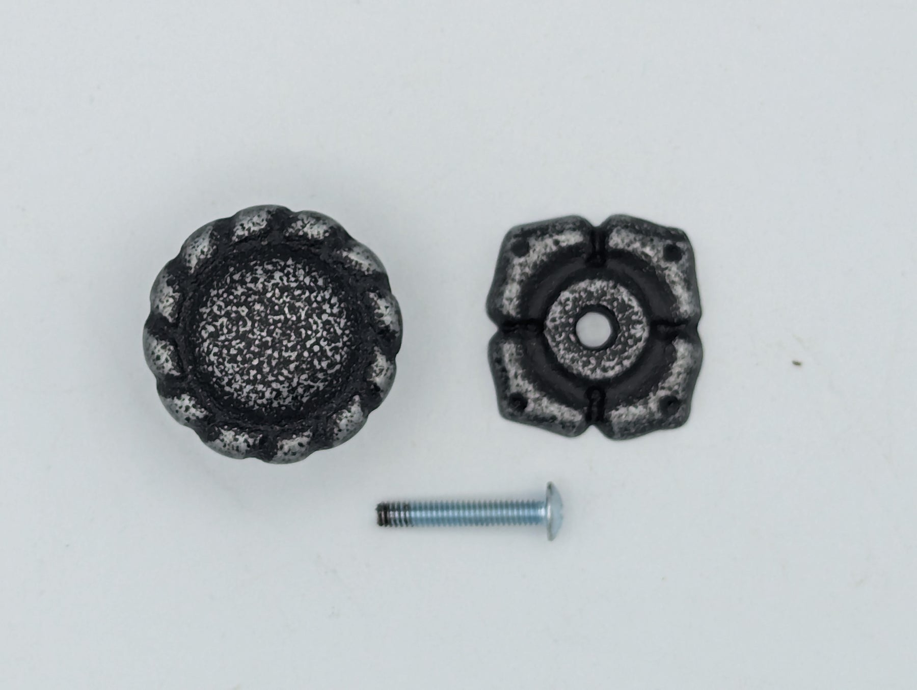 These wonderful wrought iron cabinet knobs are beautiful and these metal knobs are perfect for kitchen cabinet doors, furniture drawers, bathroom vanities, dressers, and restoration of vintage furniture. This knob comes complete with a matching back plate and hardware. Both beautiful and durable, these imported simple metal cabinet knobs are individually hand made by professional ironsmiths. These metal cabinet door knobs measure 1 3/8 (35 mm) inches in diameter and they have a projection of 1 1/4 inches (32 mm). These wrought iron cabinet knobs are sold individually and they come complete with the hardware. The bolts for the metal wrought iron cabinet door knobs measure approximately 1 inch (25 mm) long. The average lead time for this knob is approximately 3 to 5 business days.