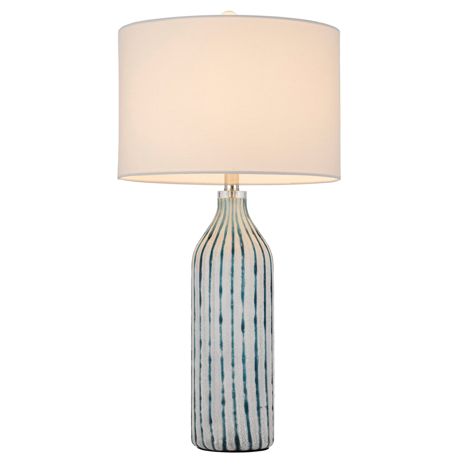 The Inveruno Glass Table Lamp, Product No. BO-3042TB, combines style and functionality with its durable glass construction and painted striped finish. Hand blown glass craftsmanship is accentuated by sleek chrome metal accents and a durable hardback linen shade, making it a vibrant addition to any room. This lamp requires a single E26 bulb with a maximum wattage of 150W and features a convenient 3-way switch for adjustable lighting. With dimensions of 16.00 inches in length and width and a height of 20.50 inches, it ships in one carton and requires minor assembly. This product comes with a one-year warranty, ensuring quality and peace of mind.