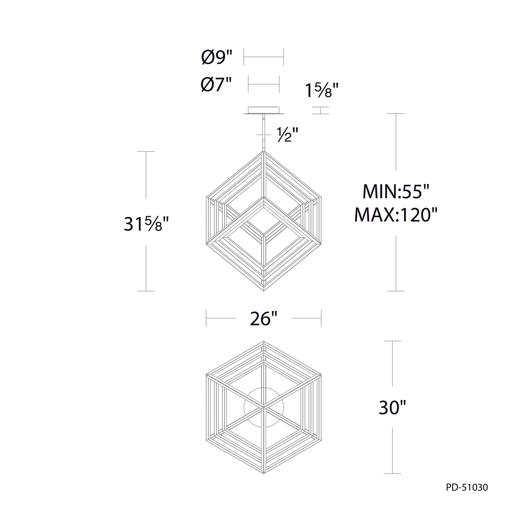 Atlas 30in LED Chandelier 3500K in Black. Reminiscent of the brilliant modern artwork of Eva Rothschild, this unique pendant features three illuminating cubes that move independently. The black finish provides striking contrast with the luminous lines of light. A recognizable bold design. Cubes rotate independently for creative display options. Stack all three cubes in the same direction for a stunning 3D cubed effect, or adjust independently for your own creative design. 10ft of wire included to extend pendant up to a total of 120in, adjustable through a push-pin locking mechanism at the canopy. Can be mounted on a slope ceiling. Driver is located in the round canopy. Universal Input Voltage Driver (120V-240V-277V) concealed within the canopy. Custom CCT options available by special order. Smooth and continuous dimming with an electronic low voltage (ELV), TRIAC, or 0-10V dimmer. High Powered Replaceable LED Module CRI: 90, Rated Hours: 50,000, Color Temp: 3500K Standards: ETL & cETL UL 1598 listed for Damp Locations.