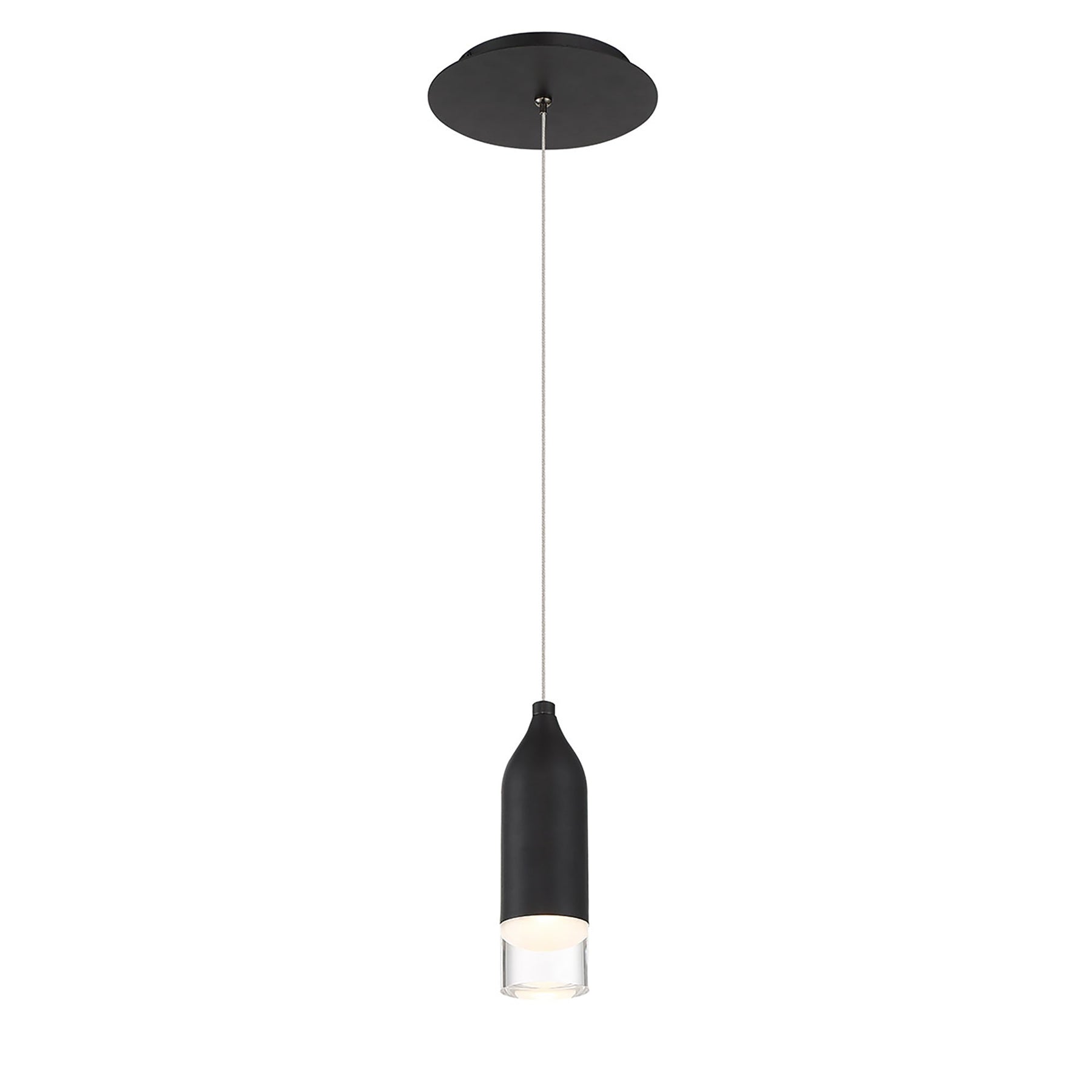 Action 2.4in LED Mini Pendant 3000K in Black. Drops of liquid metal, alone or in pairs for a futuristic look. Energy efficient integrated LED's provide a long-lasting maintenance-free bright and even illumination. Ultra-sleek electrified cable eliminates the need for clunky power wires. Height is simple to adjust through push pin connectors on the canopy. Retro style spun metal housing. Upscale quality plated metal finishes. Can be mounted on a slope ceiling. Ultra-sleek electrified cable eliminates the need for clunky power wires. Height is simple to adjust through push pin connectors on the canopy. Universal Input Voltage Driver (120V-240V-277V). Custom CCT options available by special order. Smooth and continuous dimming with an electronic low voltage (ELV) dimmer. High Powered Replaceable LED Module CRI: 90, Rated Hours: 50,000, Color Temp: 3000K Standards: ETL & cETL UL 1598 listed for Damp Locations.
