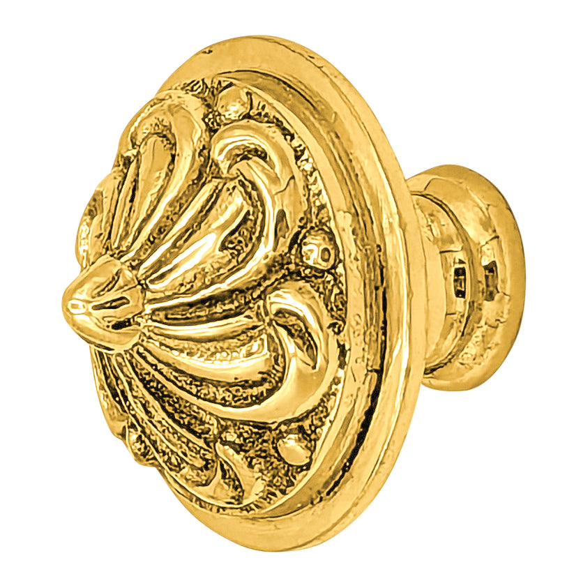 This knob measures 1 1/3 inches in diameter with a projection of 1 1/4 inch (approximate). Available in Polished Brass, Antique Brass, Black Bronze, and Polished Chrome finishes.