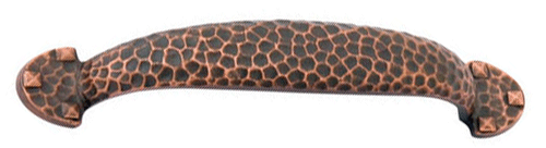 This arts & crafts style cabinet pull features a hammered design and measures 3 7/8 inches overall. Includes a 3 inch center to center mounting distance and a 1 inch projection. Comes complete with mounting hardware. This particular product has a lead time of approximately 3 to 5 business days.