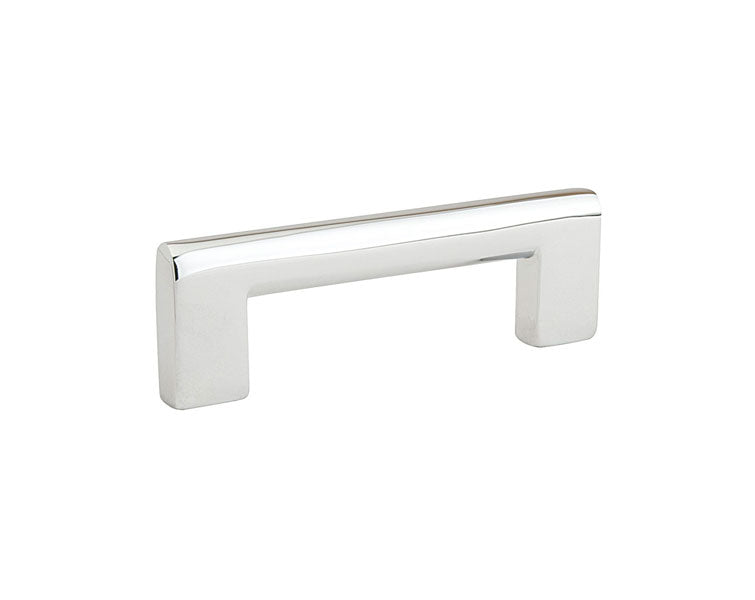 Measures 5 5/8 inches long with a 5 inch center to center mounting distance (5.00 c-c) and a projection of 1 3/8 inch. Coordinating knob available. Comes complete with mounting hardware. Available in either a polished chrome or polished nickel finish. The average lead time for this pull is approximately 3 to 5 business days.