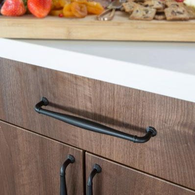 This cabinet pull is constructed from sturdy solid brass and features a transitional heritage design. Measures 6 5/8 inches overall with a 6 inch center to center mounting distance. Features a 1 3/8 inch projection and comes complete with mounting hardware. Available in a several finishes such as satin brass, oil rubbed bronze, polished nickel, satin nickel, flat black and polished chrome. The average lead time for this pull is approximately 3 to 5 business days.