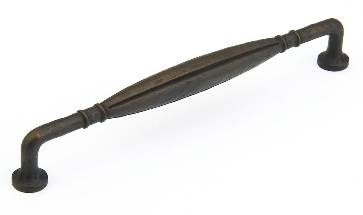 Schaub & Company's Siena Collection uses rustic textures to create a collection that gives your home a down-to-earth feeling. This cup pull measures 8 3/4 inches, and has a projection of 1 3/8 inches with a center-to-center mounting distance of 8.00 inches. Comes complete with mounting hardware and is also available in vibra nickel. Available in either ancient bronze or vibra nickel. The average lead time for this pull is approximately 3 to 5 business days.