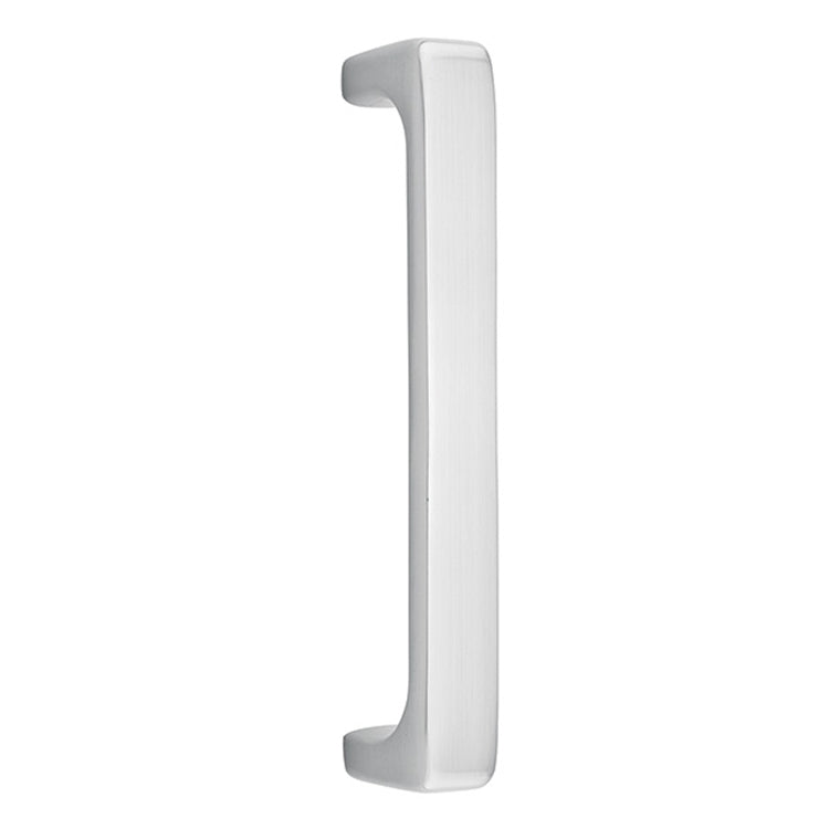 This door pull is constructed from stainless steel and measures 8 5/8 inches end-to-end by 13/16 of an inch wide. Its projection is 2 1/8 inches and its center-to-center measurement is 8 inches.