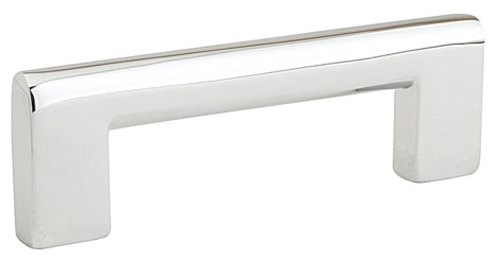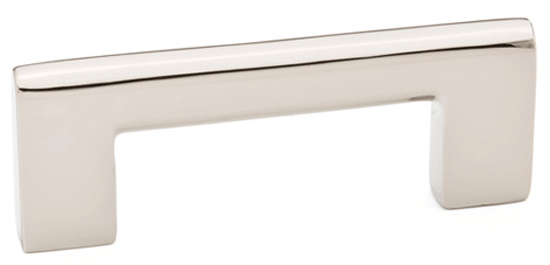Measures 3 5/8 inches long with a 3 inch center to center mounting distance (3.00 c-c) and a projection of 1 3/8 inch. Coordinating knob available. Comes complete with mounting hardware. Available in either polished chrome or polished nickel. The average lead time for this pull is approximately 3 to 5 business days.