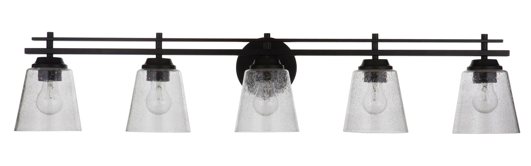 The Drake 5 Light Vanity in Flat Black presents a striking double rail silhouette complemented by clear seeded glass globes, making it a perfect addition to both transitional and traditional decor. This wall-mounted fixture is damp rated, ensuring it can withstand humid environments, and requires five medium base 60 watt bulbs (not included). With dimensions of 42 inches in width, 42 inches in depth, and 8.5 inches in height, it also features an extension of 7.88 inches and includes a 1-year limited warranty.