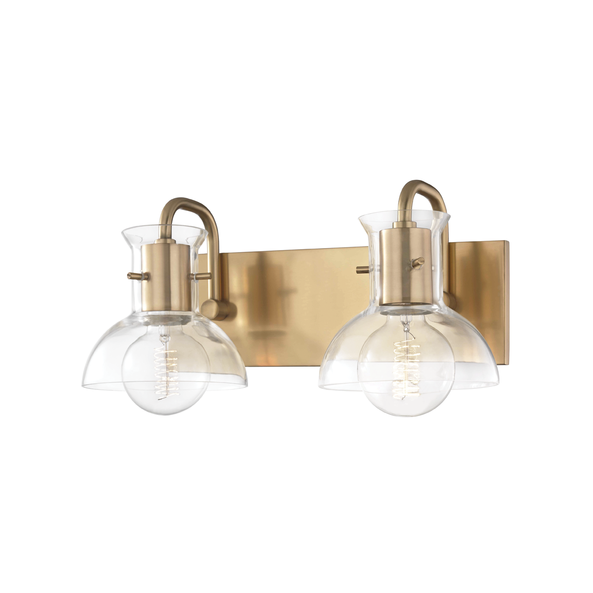The Riley Wall Sconce by Mitzi offers a sophisticated lighting option with a contemporary flair. This elegant sconce features a clear glass shade and accommodates two E26 medium base bulbs, each with a maximum wattage of 60W. With dimensions of 14.50 inches in width and 7.00 inches in height, and a 7.75-inch extension, it enhances any space effortlessly. Available in two stunning finishes—Aged Brass and Polished Nickel—this fixture is rated for UL Damp locations, making it ideal for humid areas like bathrooms.