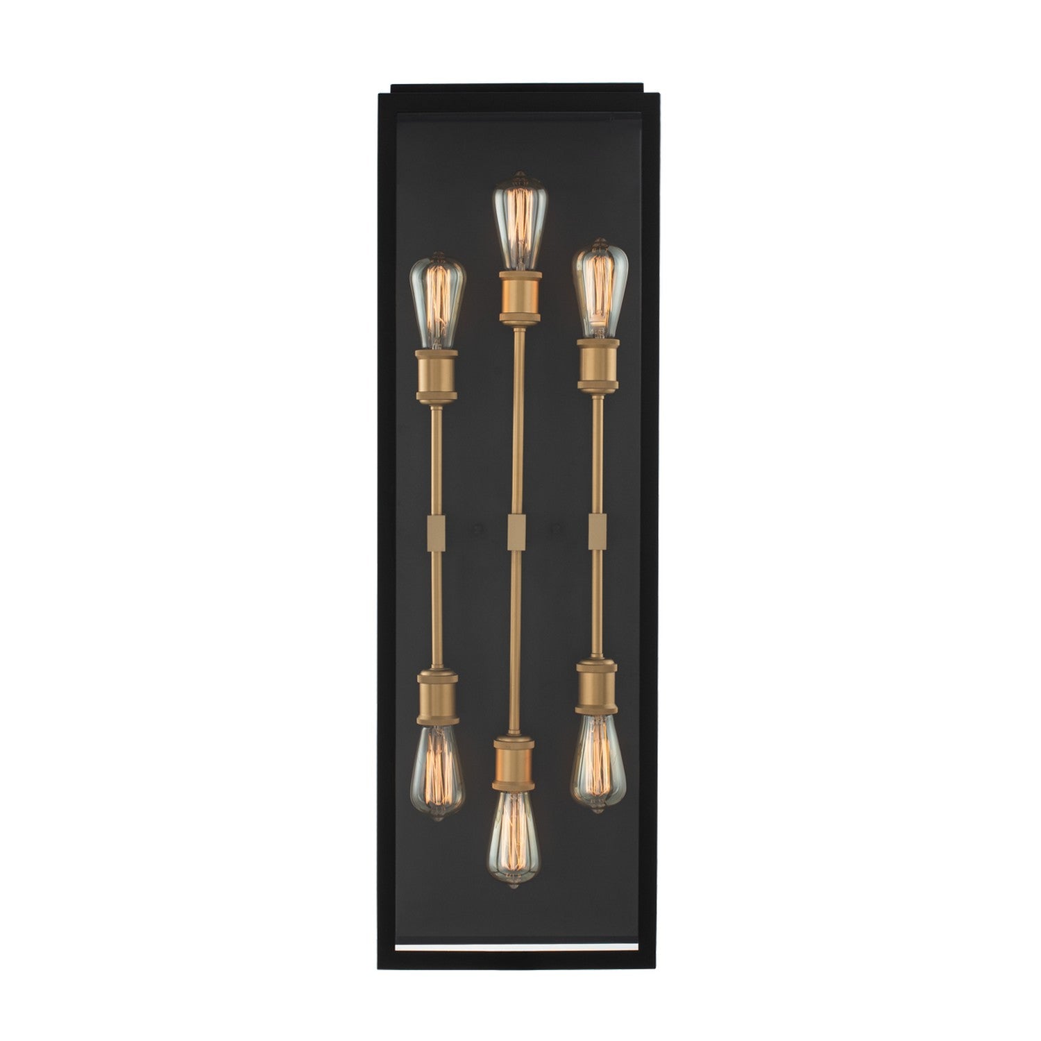 The Ashland Large Wall Sconce offers a contemporary outdoor lighting solution with its unique combination of matte black and sanded gold finishes. Measuring 12 inches in width and 38 inches in height, this sconce requires six E26 medium base bulbs (not included) with a maximum wattage of 40W each. It features a 7-inch wire length, weighs 6 lbs, and is UL-cUL rated for safety. With partial assembly required, this stylish fixture is designed to enhance your outdoor spaces while providing a reliable lighting experience.