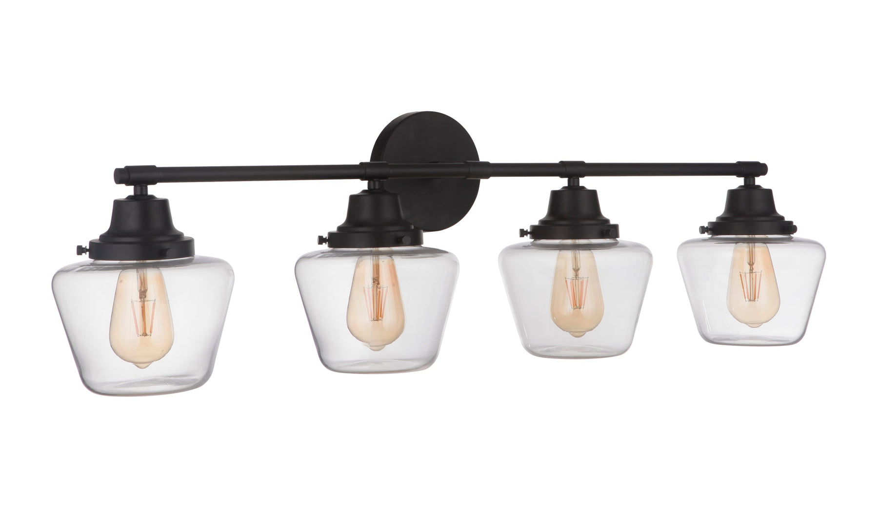 The Essex 4 Light Vanity in Flat Black is a stunning addition to any bathroom or vanity area. This elegant fixture features clear glass schoolhouse globes and requires four medium base 60 watt bulbs (not included) to illuminate your space. With dimensions of 38 inches in width, 38 inches in depth, and 11 inches in height, it also has a 9-inch extension from the wall. Designed for damp locations, this vanity light is UL Damp Rated, ensuring safety and durability in humid environments. The backplate measures 5.50 inches by 5.50 inches and is just 1 inch deep, providing a sleek look.