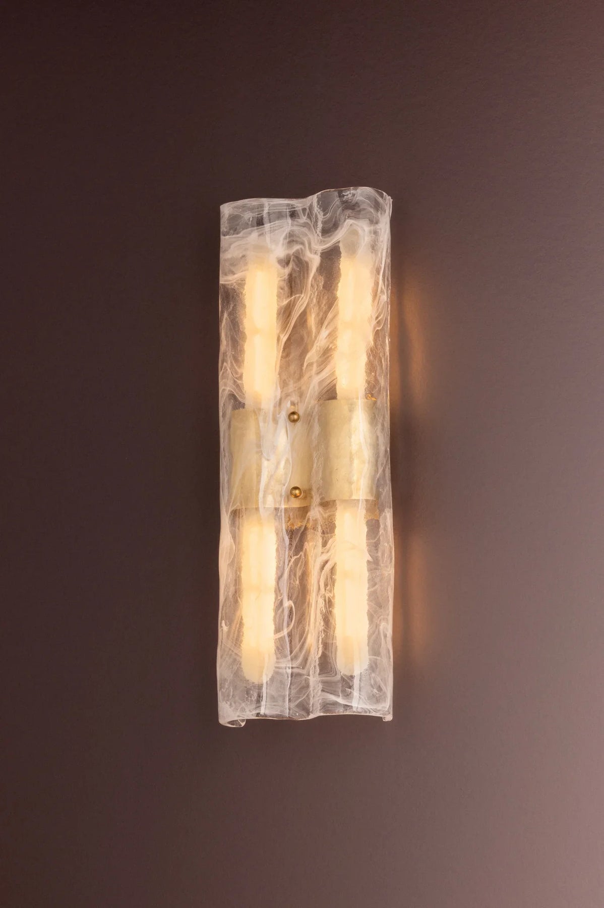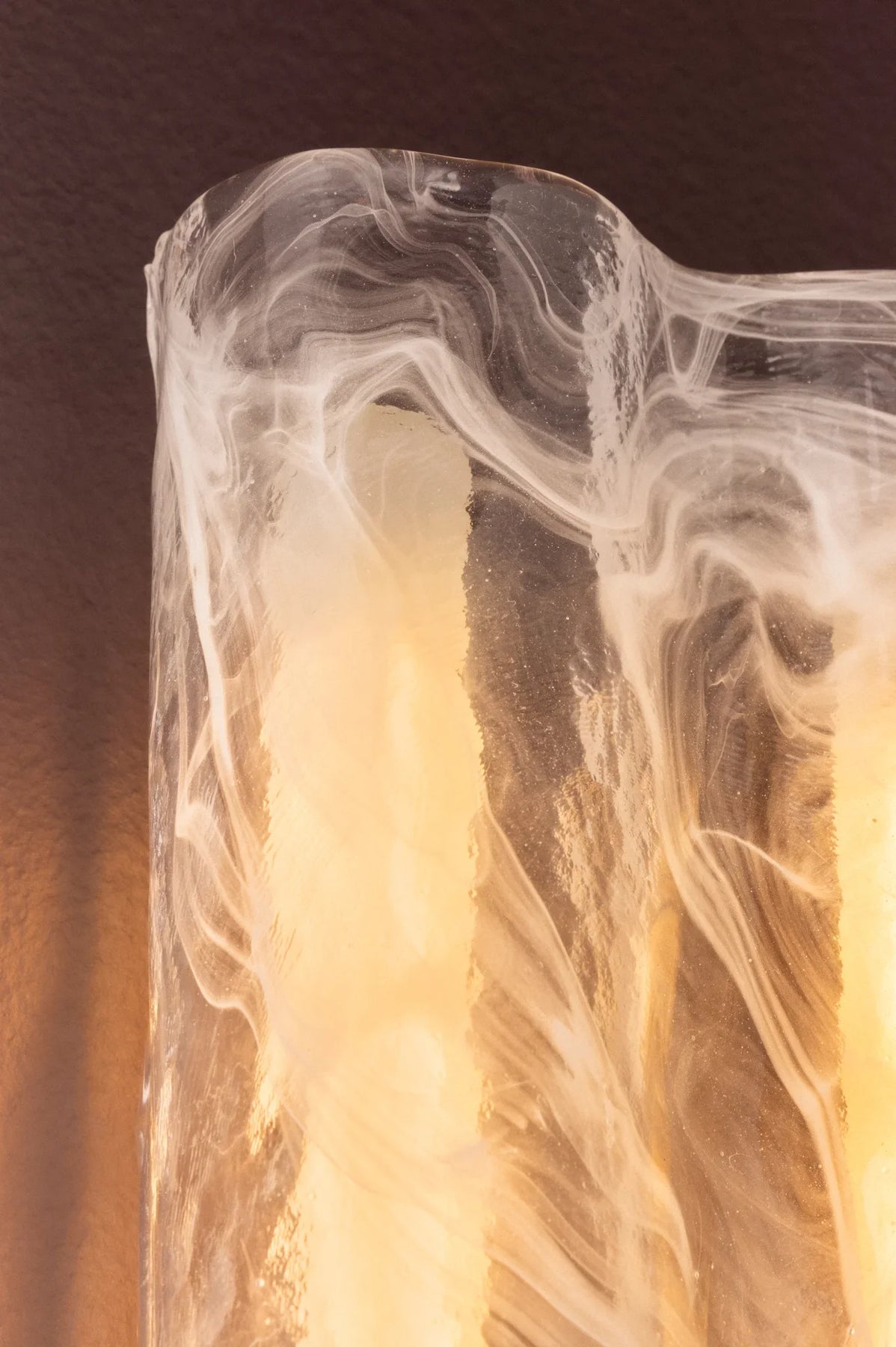 Organic shaping, specialty glass, and a subtle peek of metal combine to form the enigmatic Bromo sconce. Made from clear Blonchino glass, the tubular shade swirls with wispy white tendrils that evoke the natural movement of smoke. From within the shade, glimpses of the Vintage Brass finish on the hardware shine through like a hidden treasure, adding an artful glint to this wall light.