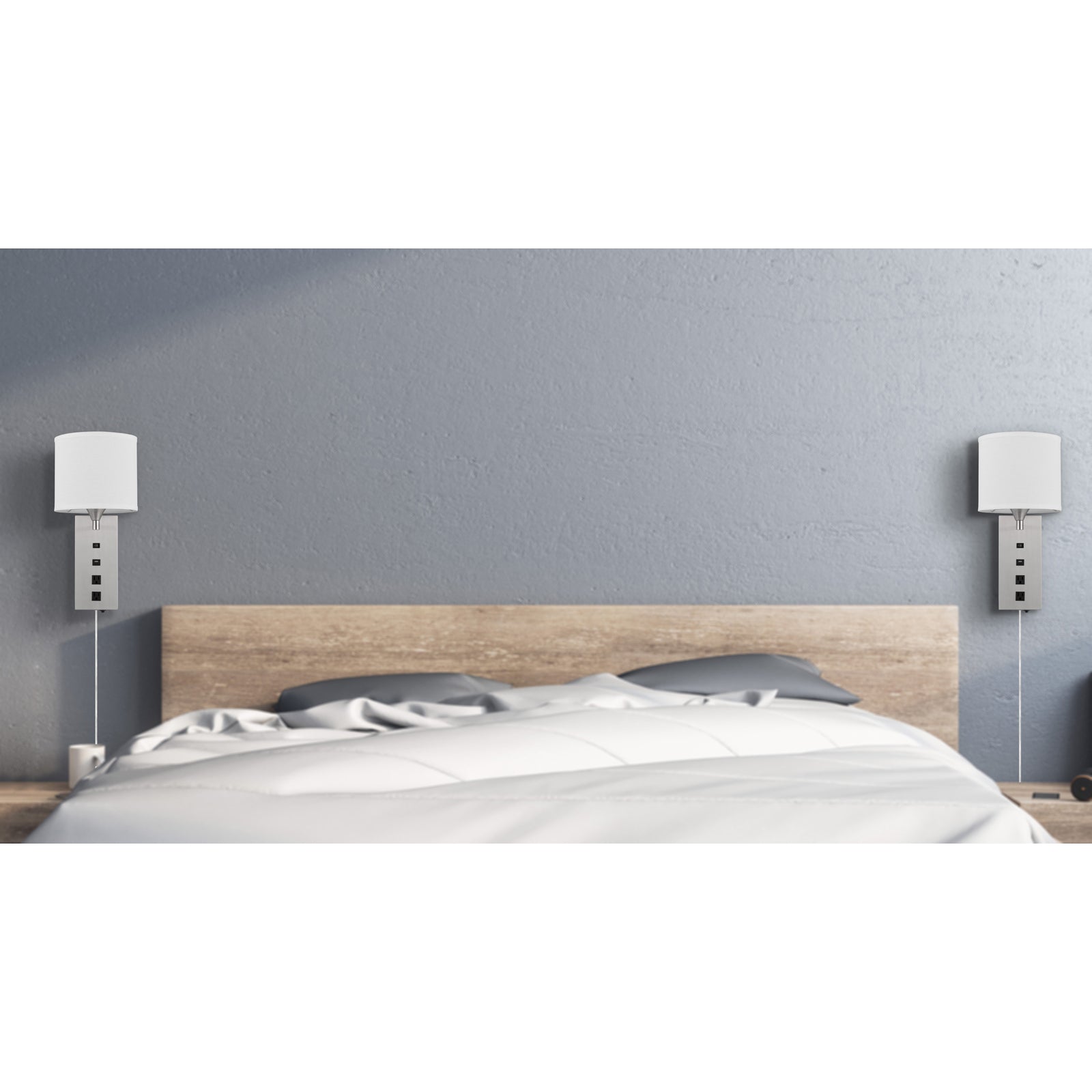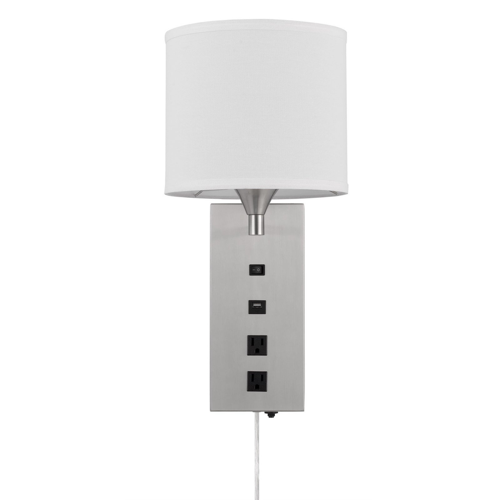 The LA-8049WL-1 Reedsport Wall Lamp is a modern and functional lighting solution, ideal for any room in your home. This lamp boasts a durable metal construction and requires a single E26 base bulb with a maximum wattage of 60W. Measuring 4.80 inches in length, 16.00 inches in width, and 15.00 inches in height, it features a round hardback fabric shade that adds elegance to its design. With a USB port, a functional outlet on the base, and a convenient rocker switch, this wall lamp is perfect for providing both illumination and utility. Assembly is required, and it comes with a one-year warranty against defects in material and workmanship.